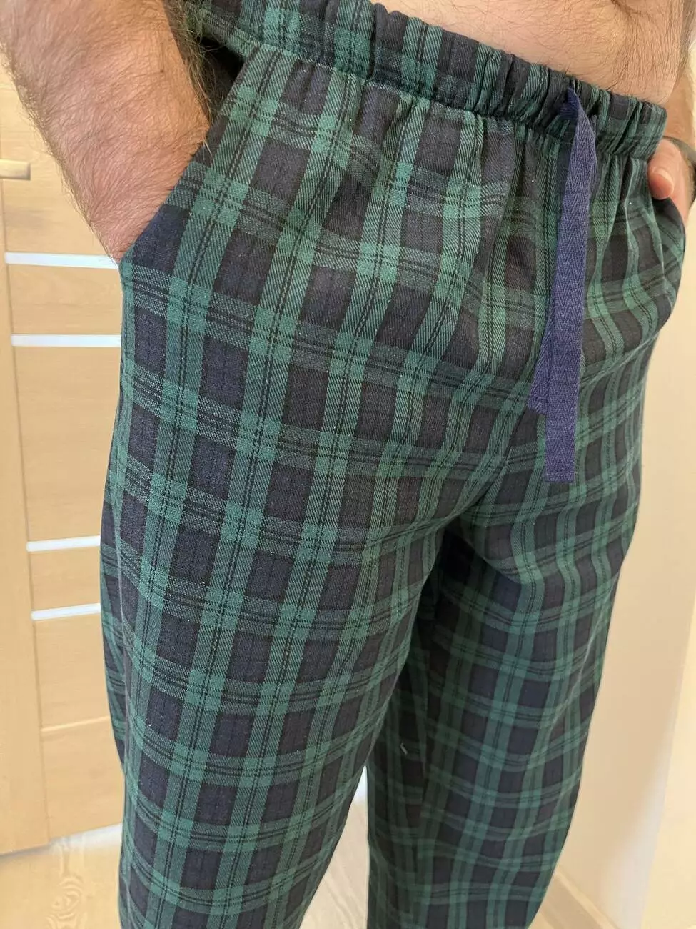 Наші нові чоловічі піжамні штани — це ідеальний баланс елегантності та зручності. Зелено-темно-синя клітинка надає образу витонченості, створюючи стильний акцент у домашньому гардеробі. Регульований пояс на кулісці дозволяє підігнати посадку під себе, забезпечуючи комфорт протягом усього дня.
