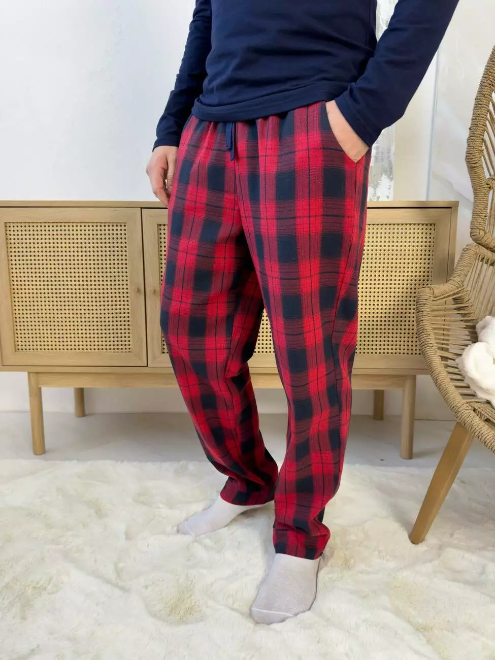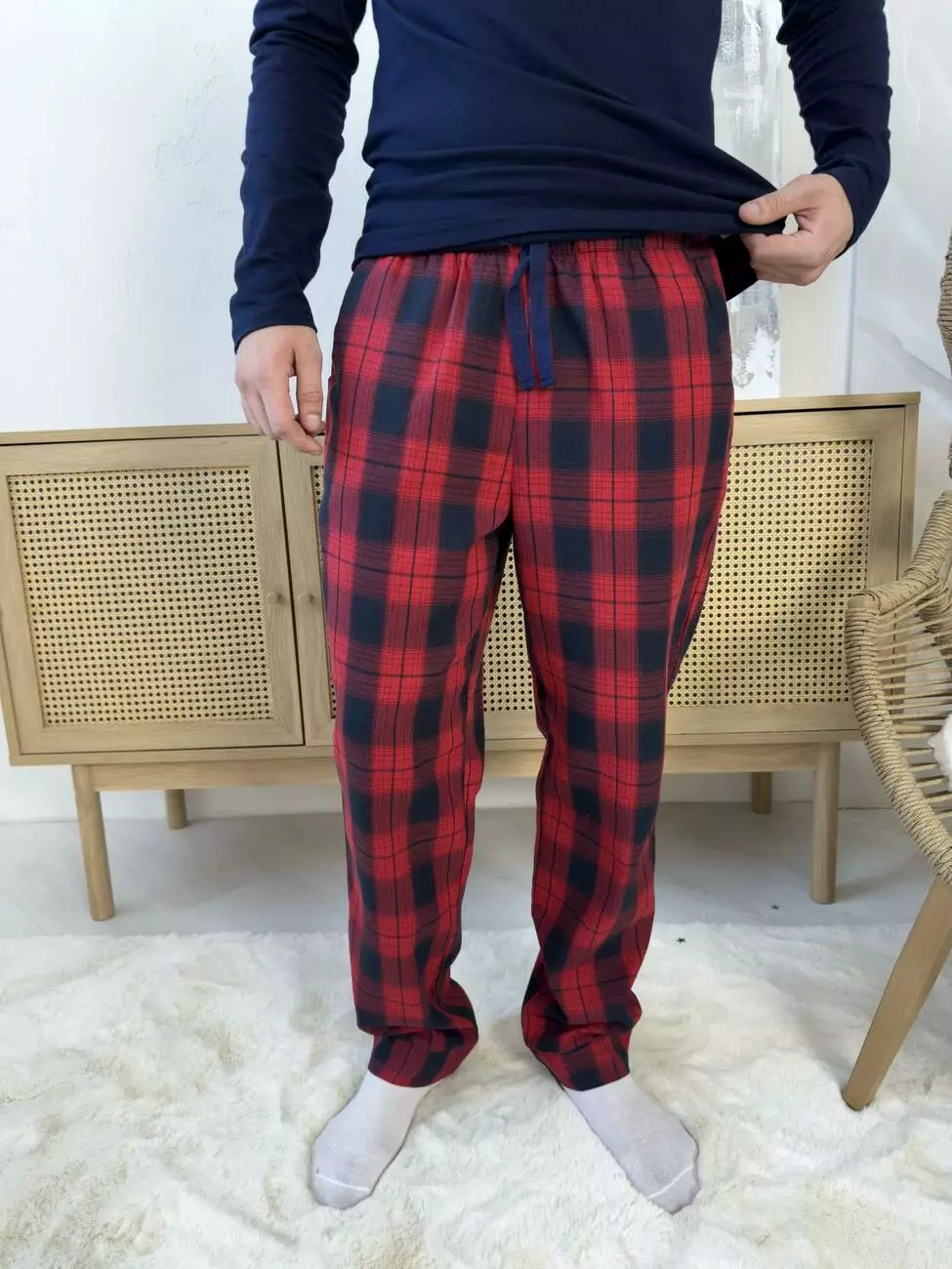 Чоловічі піжамні штани — це не просто зручний одяг для дому, а універсальна річ, що поєднує комфорт і стиль. Виконані у благородній червоно-синій клітинці, яка плавно переходить від одного кольору до іншого, вони створюють яскравий і водночас стриманий образ.