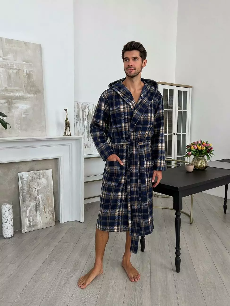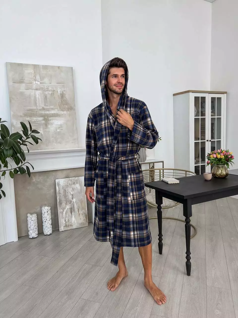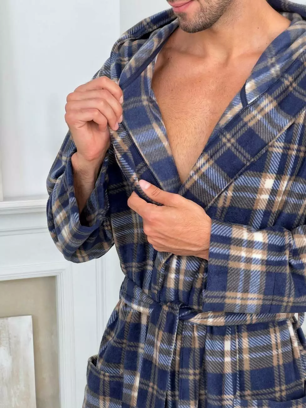 Чоловічий халат COSY флісовий з капюшоном, клітина синьо-коричнева