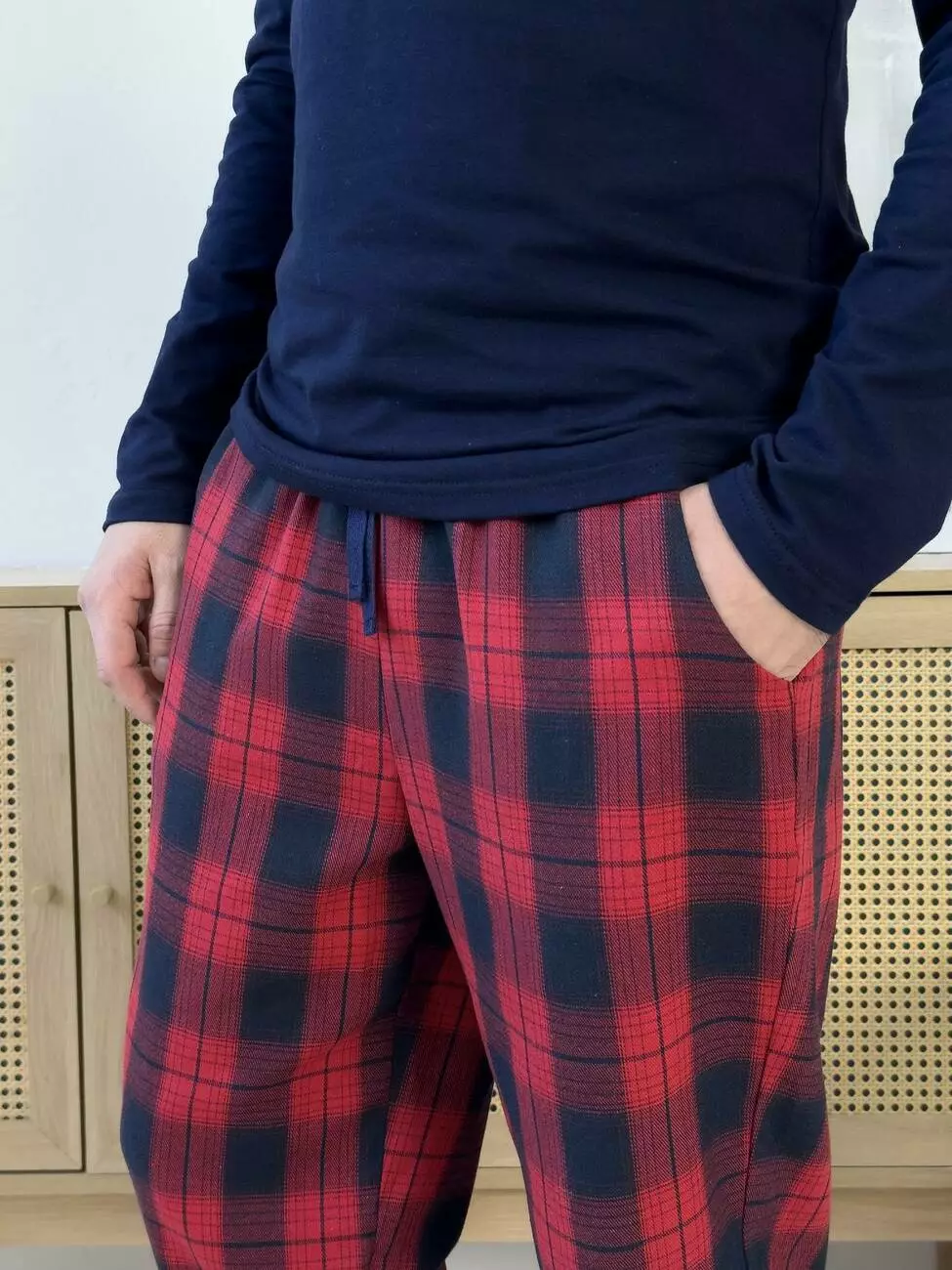Штани: Яскрава червоно-синя клітинка додає комплекту характеру.