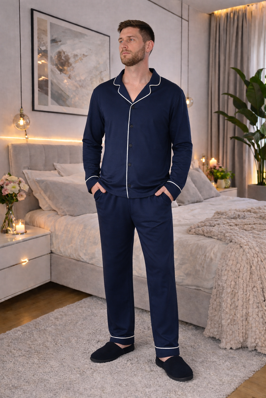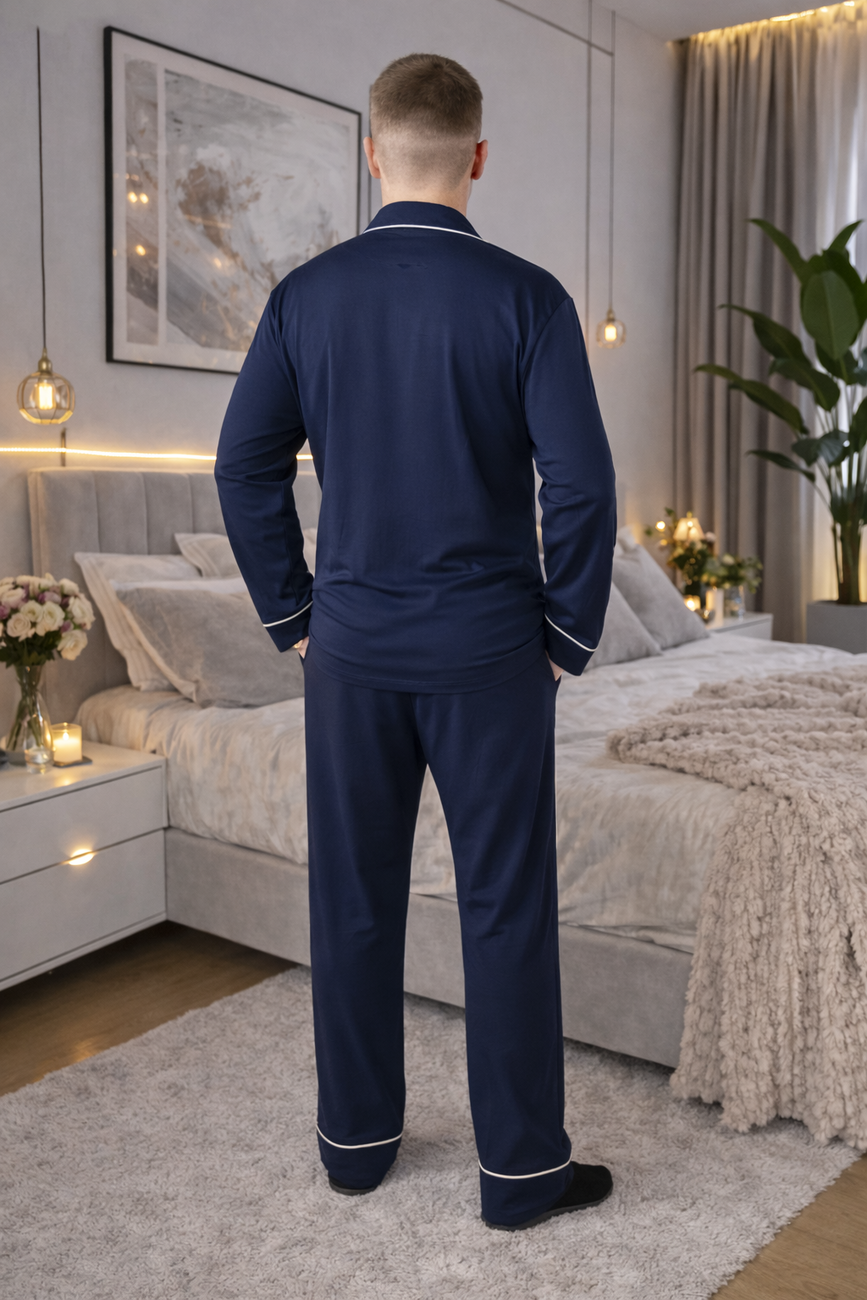 Цей комплект у глибокому синьому кольорі Midnight Navy створений для тих, хто цінує естетику навіть удома. Контрастний бежевий кант додає образу структурованості та стриманого шику, роблячи домашній одяг по-справжньому статусним.