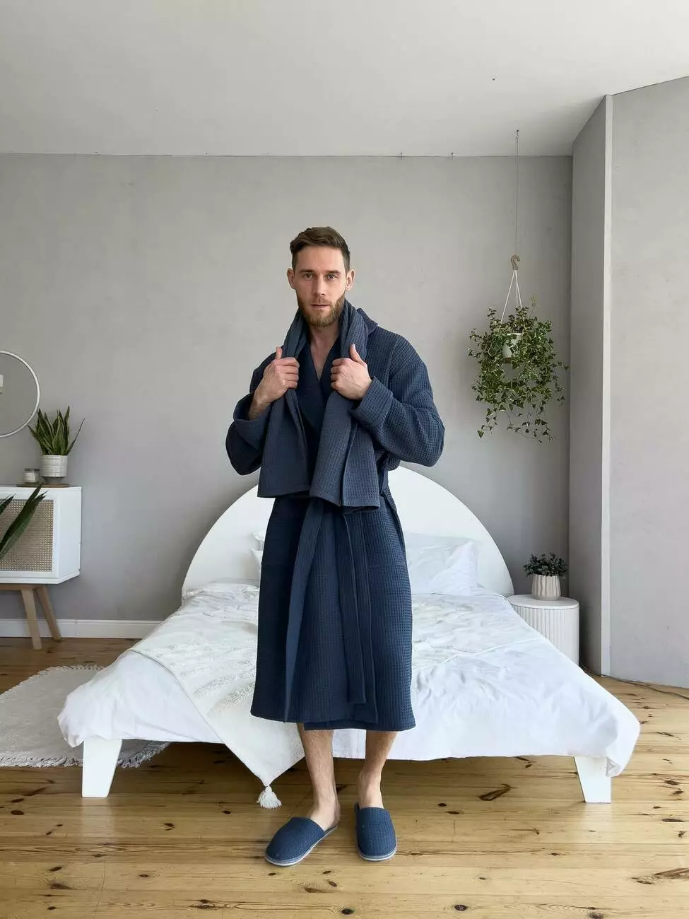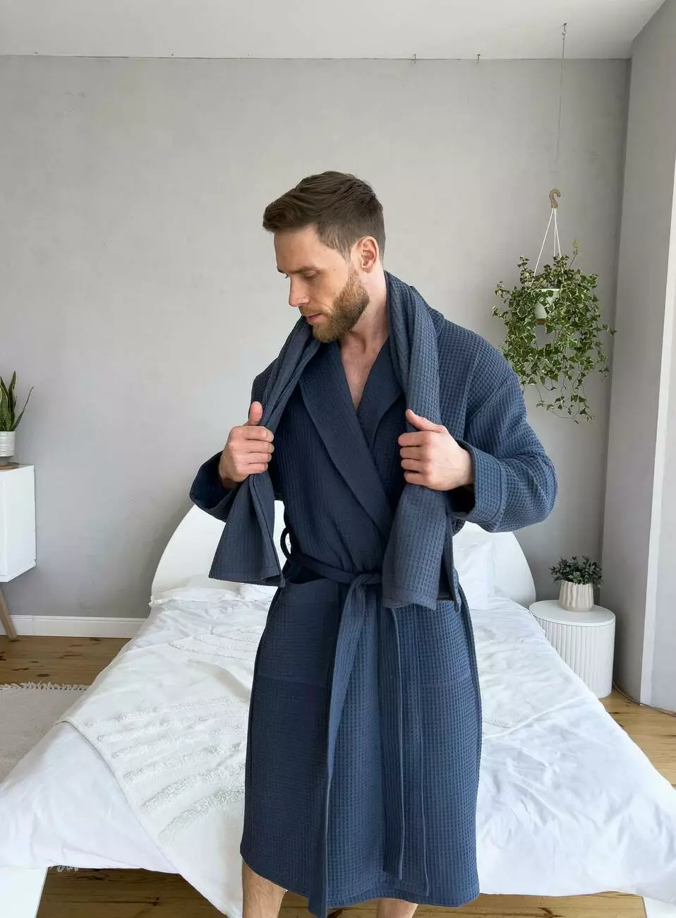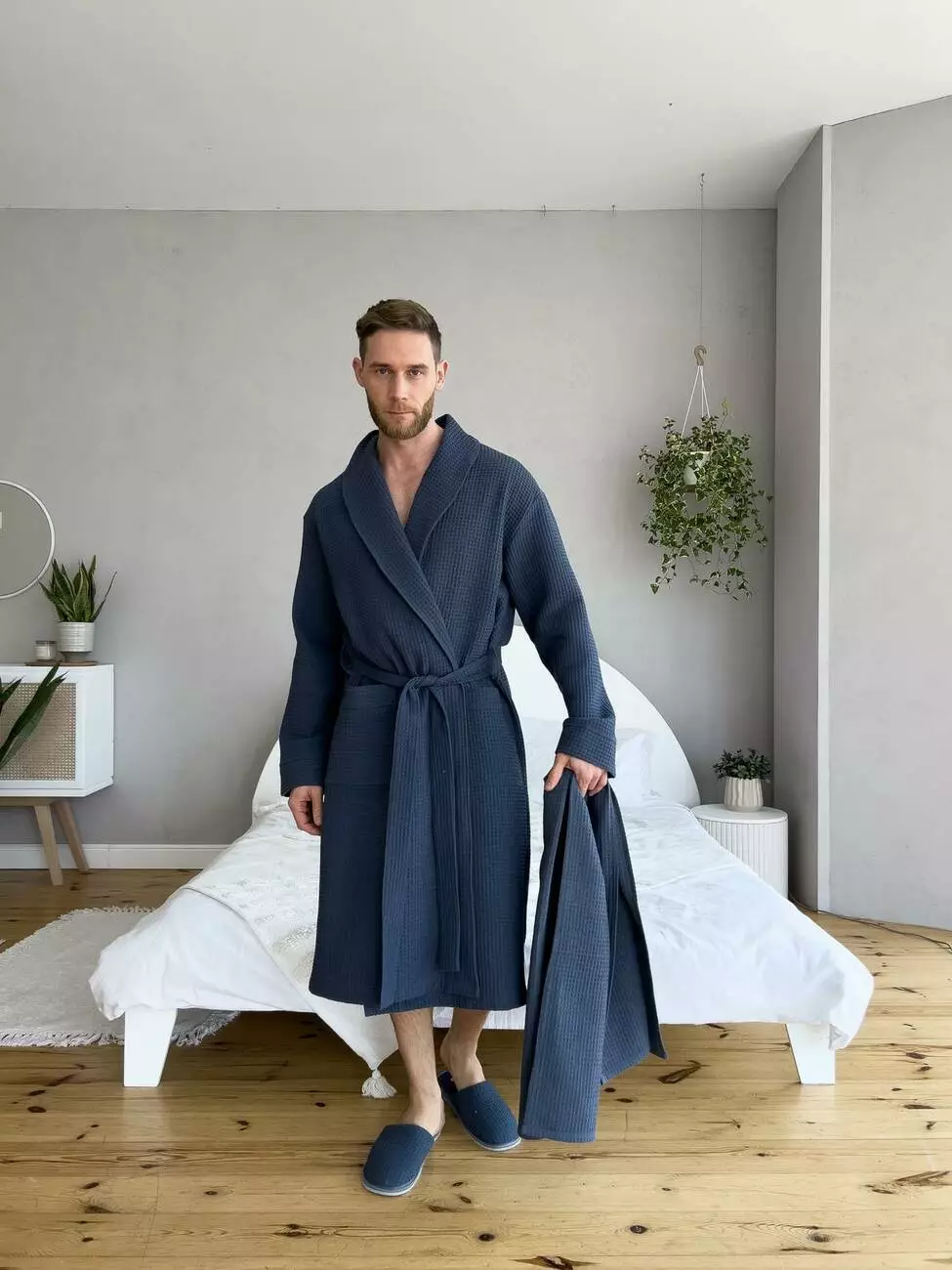 Елегантний чоловічий халат «Сапфір» із шалевим коміром виконаний із високоякісної вафельної тканини.