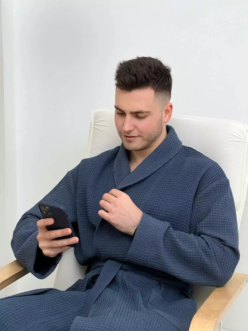 Елегантний чоловічий халат «Сапфір» із шалевим коміром виконаний із високоякісної вафельної тканини.