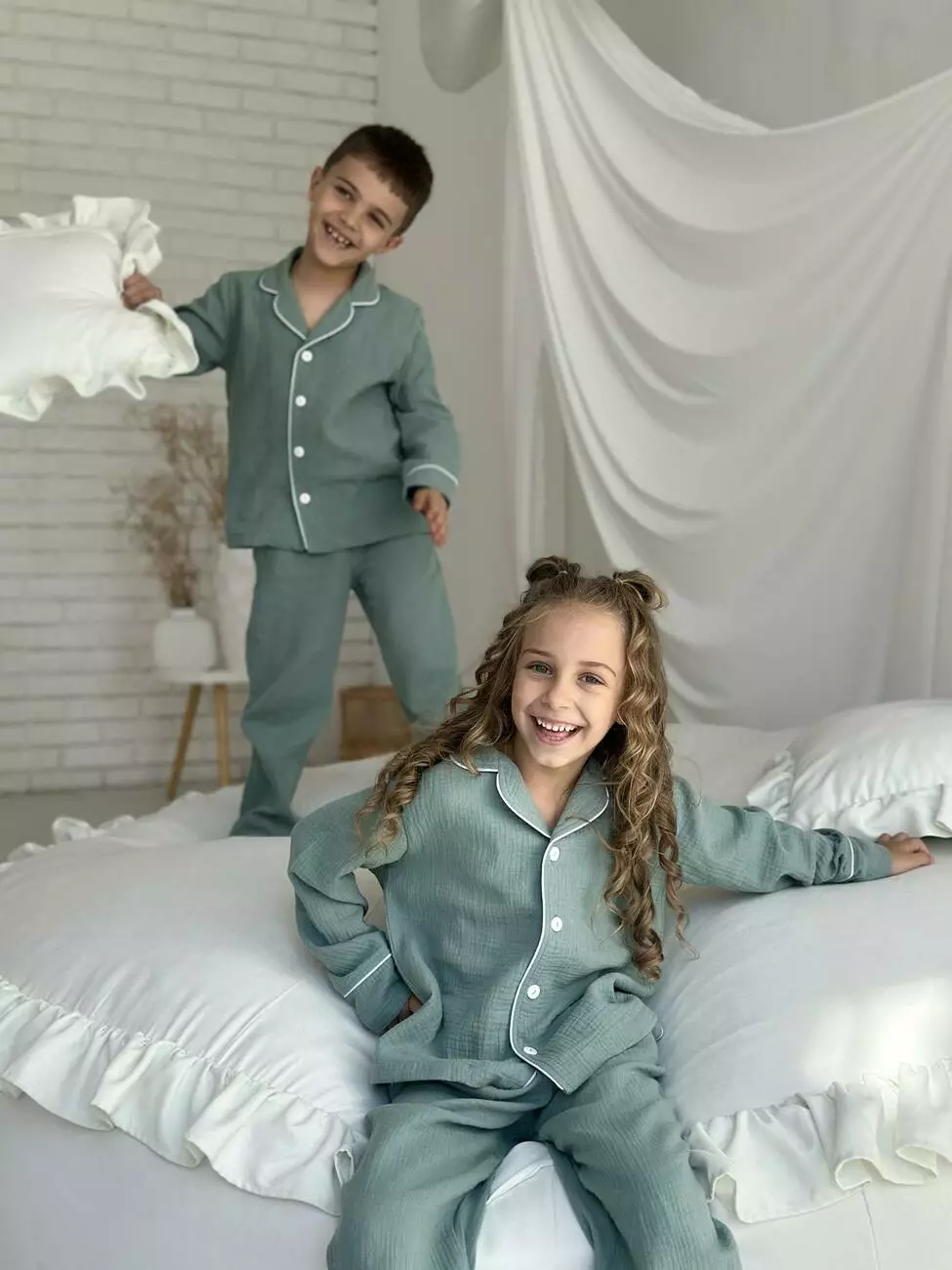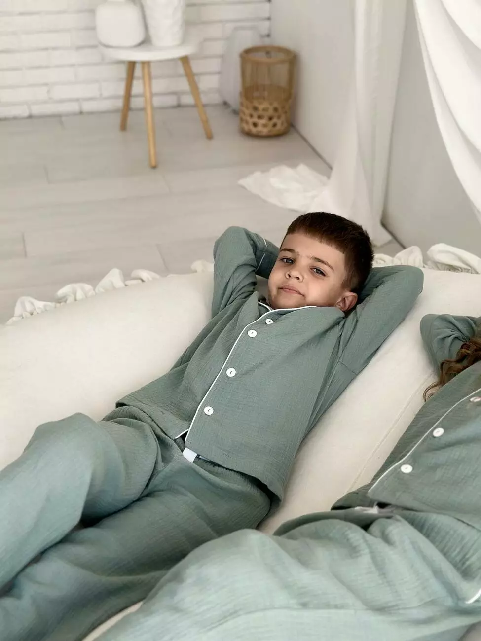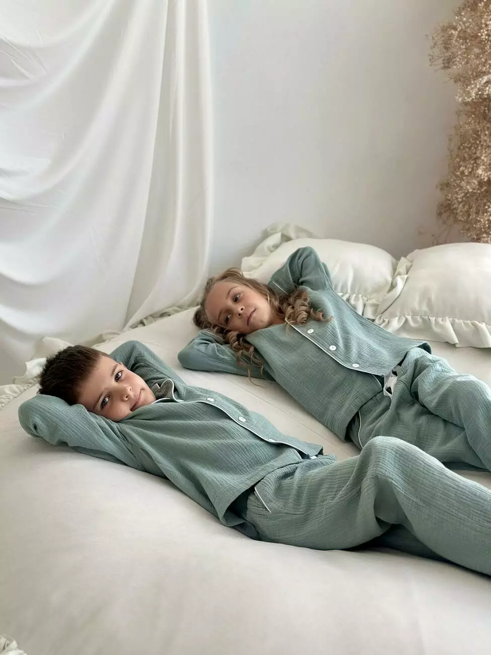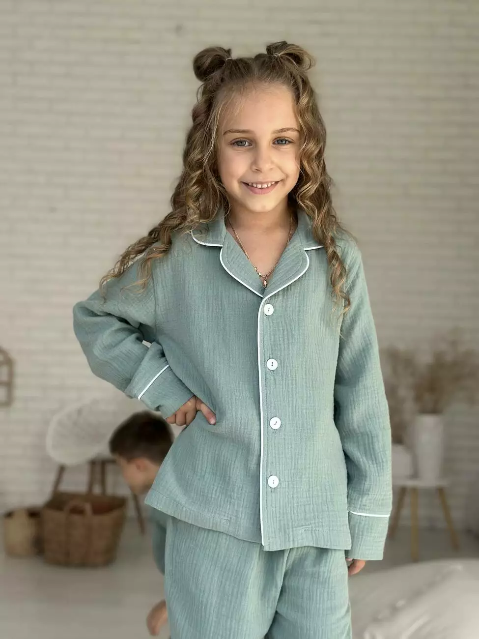 Дитяча муслінова піжама VIVA — комфорт для всієї родини Піжама з серії VIVA — це м’якість і натуральність, які відчуваються в кожному дотику. Створена для дітей ростом від 116 до 146 см (приблизно від 5 до 12 років), ця піжама дарує свободу рухів та затишок під час сну й ігор. Комплект: сорочка з довгим рукавом на ґудзиках + штани з еластичною резинкою та кулискою для регулювання Колір: натуральний евкаліпт — спокійний і універсальний Тканина: двошаровий муслін з 100% бавовни — дихаючий, м’який і гіпоалергенний Особливості моделі: - Еластична резинка та кулиска на штанах для ідеальної посадки - Манжети на штанах із можливістю підвороту — піжама росте разом із дитиною - Декоративний кант додає стильний та охайний вигляд Сорочка на ґудзиках — зручно одягати і знімати Муслін — натуральний і дихаючий матеріал, що піклується про шкіру малюка Піжама VIVA — частина сімейної колекції, у якій є аналогічні моделі для дорослих. Тепер ваша родина може насолоджуватись затишком і гармонією в однакових піжамах, створюючи теплі сімейні традиції. На дітях піжами розмір M(на зріст 116-122) Зріст: Дівчинка - 117, хлопчик -122