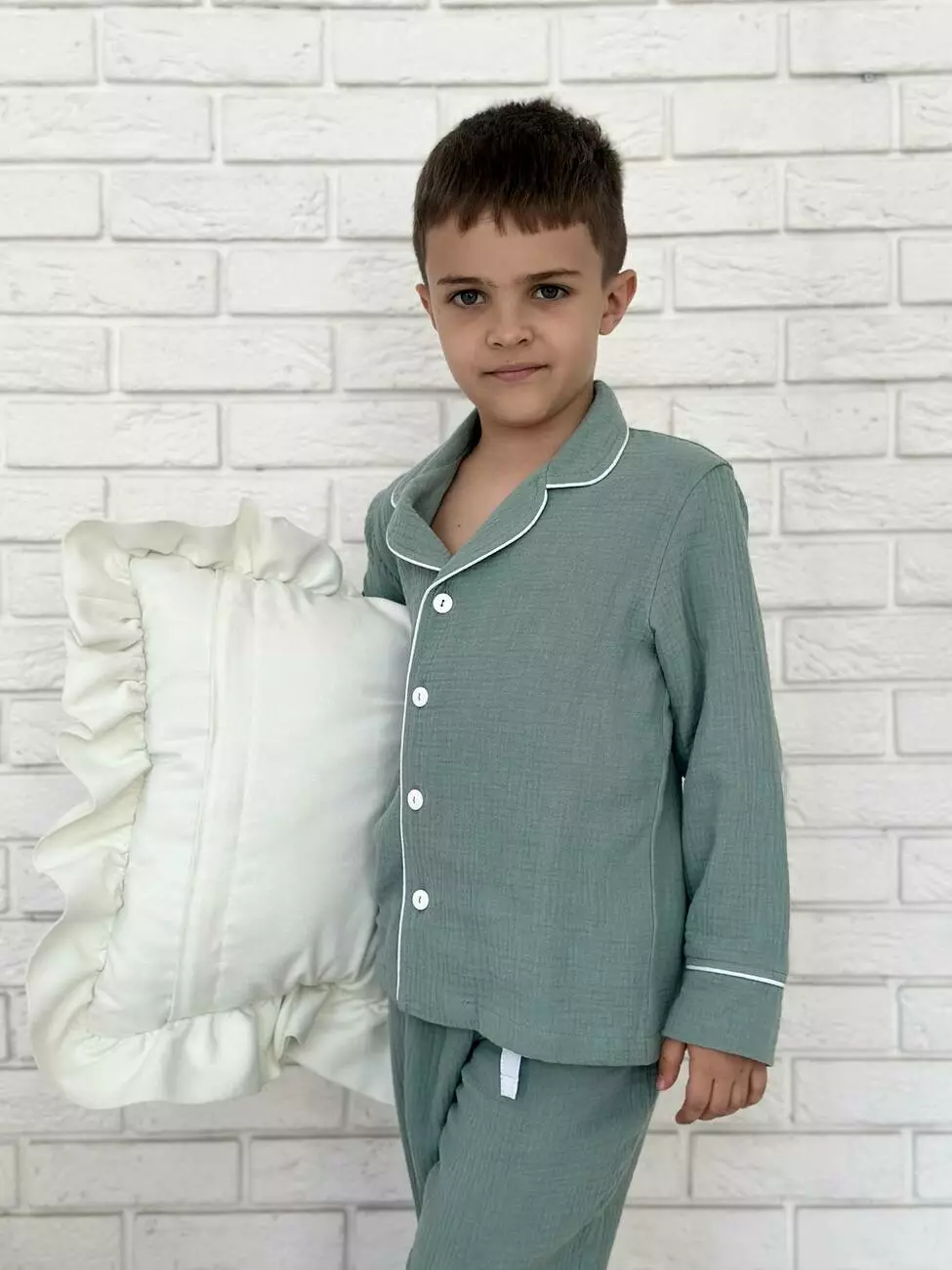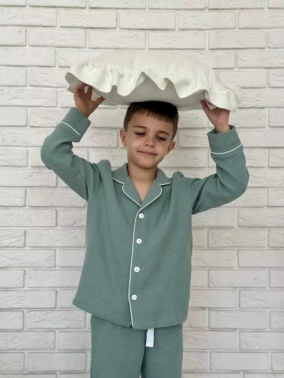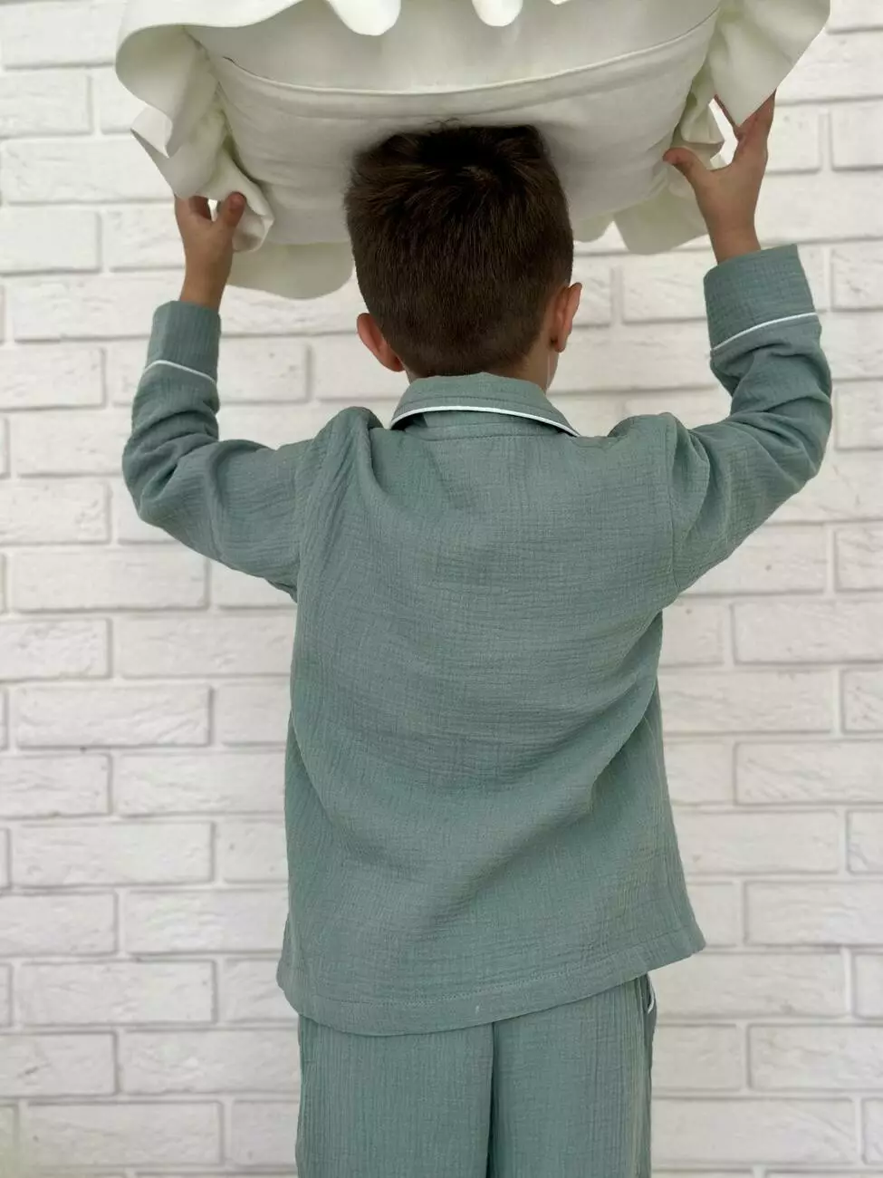 Дитяча муслінова сорочка VIVA з довгим рукавом — комфорт і стиль у кожному дотику Сорочка з колекції VIVA — це поєднання м’якості, натуральності та зручності, яку діти оцінять з першого одягання. Створена для росту від 116 до 146 см (приблизно 5–12 років), вона дарує свободу рухів та приємні відчуття як під час сну, так і вдома у час відпочинку. Особливості моделі: - Класичний крій із довгим рукавом — ідеально для затишку та ніжного тепла - Застібка на ґудзики — легко одягати й знімати - Декоративний білий кант, що додає охайності та вишуканості - Природний колір евкаліпт — спокійний і універсальний Тканина: 100% бавовна, двошаровий муслін — дихає, не парить, приємний до шкіри, гіпоалергенний. Сорочку можна поєднувати з мусліновими штанами або шортами з цієї ж серії, створюючи як класичний піжамний комплект, так і легкий домашній образ. VIVA — це частина сімейної колекції, де є моделі для дорослих, тож можна створювати гармонійні образи “як у мами і тата” та робити час удома ще теплішим. На дітях піжами розмір M(на зріст 116-122) Зріст: Дівчинка - 117, хлопчик -122