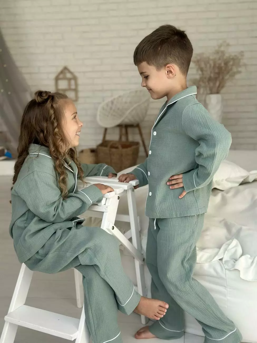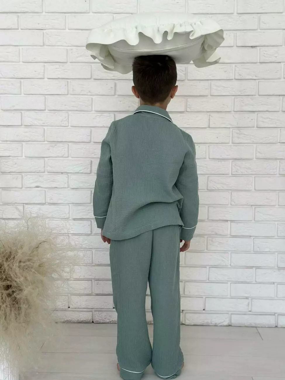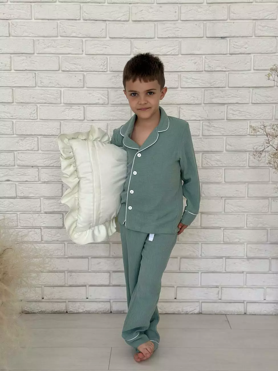 Дитячі муслінові штани VIVA — універсальна база для сну та відпочинку М’які, натуральні та зручні — ці муслінові штани з колекції VIVA стануть улюбленою частиною гардероба вашої дитини. Ідеально підходять для сну, домашнього носіння або затишних вечорів з родиною. Можна комбінувати: - з сорочкою на ґудзиках для створення класичного піжамного образу - з футболкою — для легкого, невимушеного домашнього луку Особливості моделі: - Тканина: 100% бавовна, двошаровий муслін — дихає, не парить, приємний до шкіри - Колір: евкаліпт — природний, спокійний - Пояс: м’яка резинка + кулиска — легко регулюється, не тисне Манжети на штанинах: можна підвернути або опустити — підлаштовується під зріст дитини Ідеальні на теплу пору року або коли вдома комфортна температура Ці штани — частина родинної колекції VIVA, де доступні аналогічні моделі й для дорослих. Можна створити гармонійні образи “як у мами і тата” або міксувати з улюбленими домашніми речами. VIVA — свобода рухів і натуральність, яку хочеться носити щодня. На дітях піжами розмір M(на зріст 116-122) Зріст: Дівчинка - 117, хлопчик -122