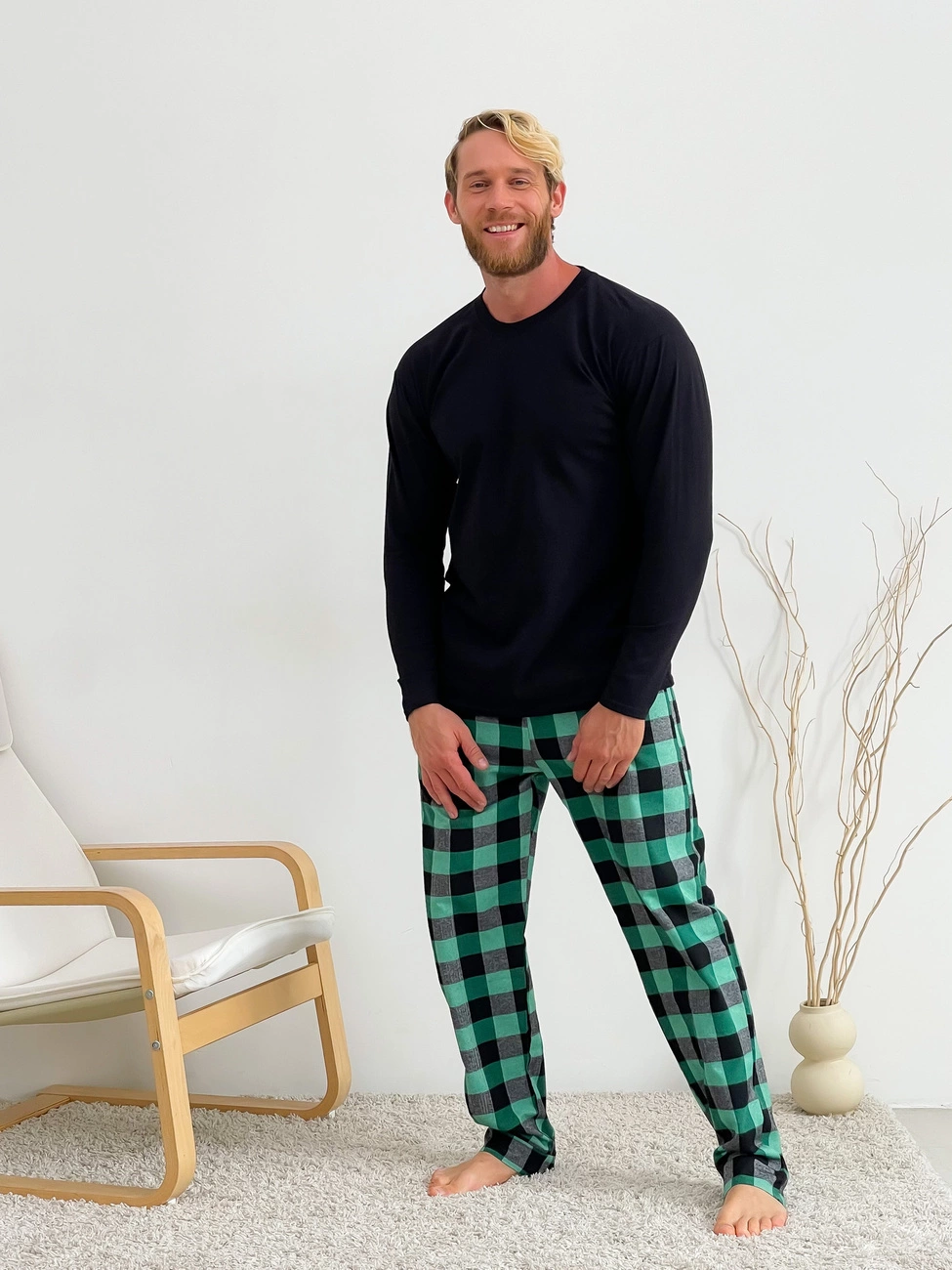 Домашня піжама для чоловіків COSY із фланелі (штани+лонгслів) зелено/чорний