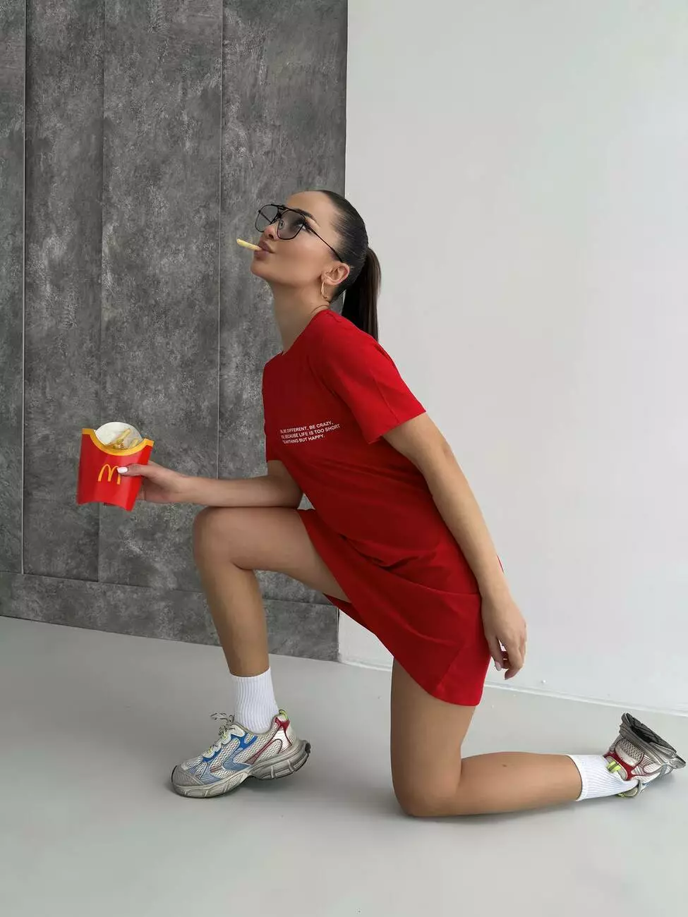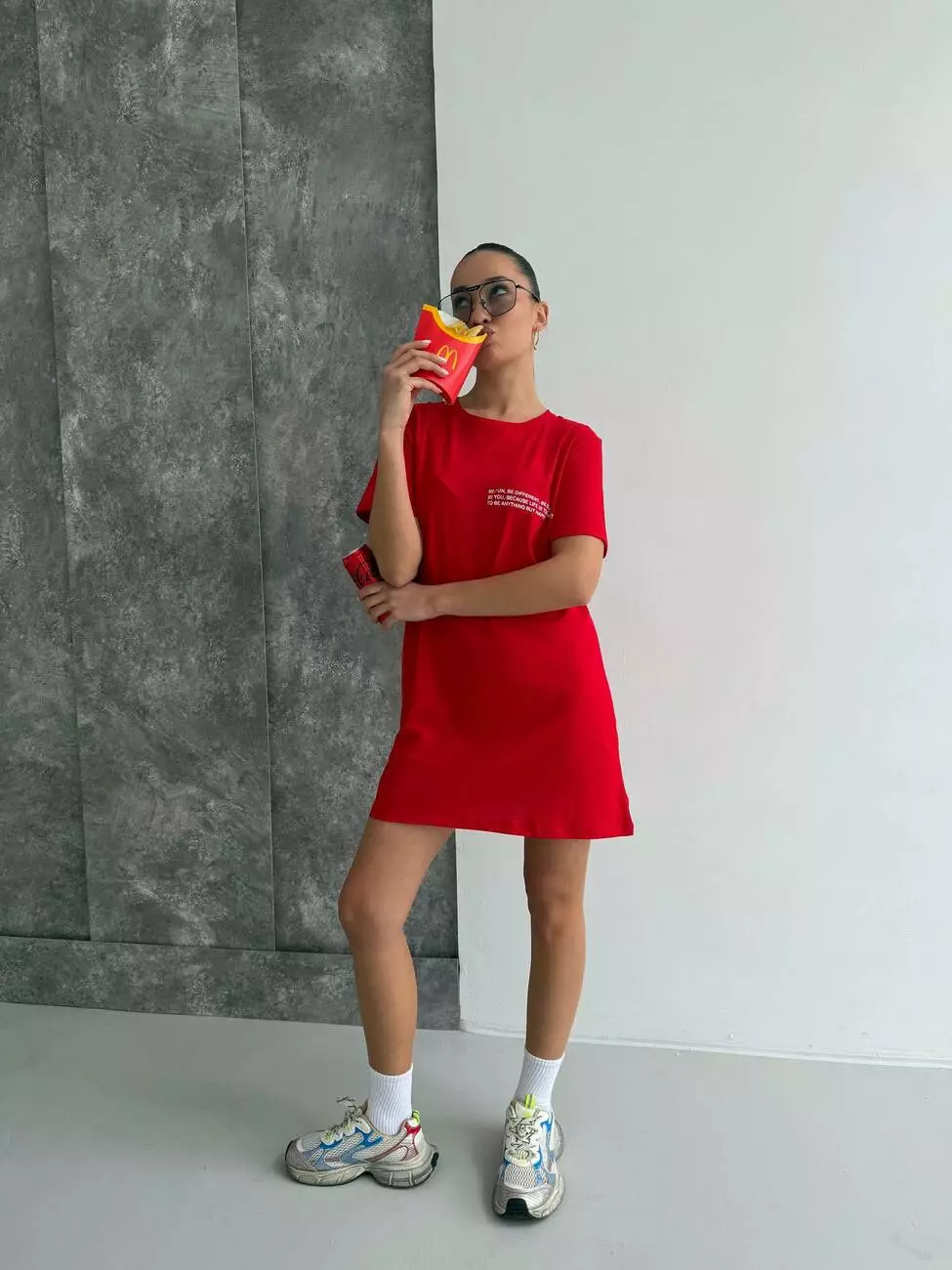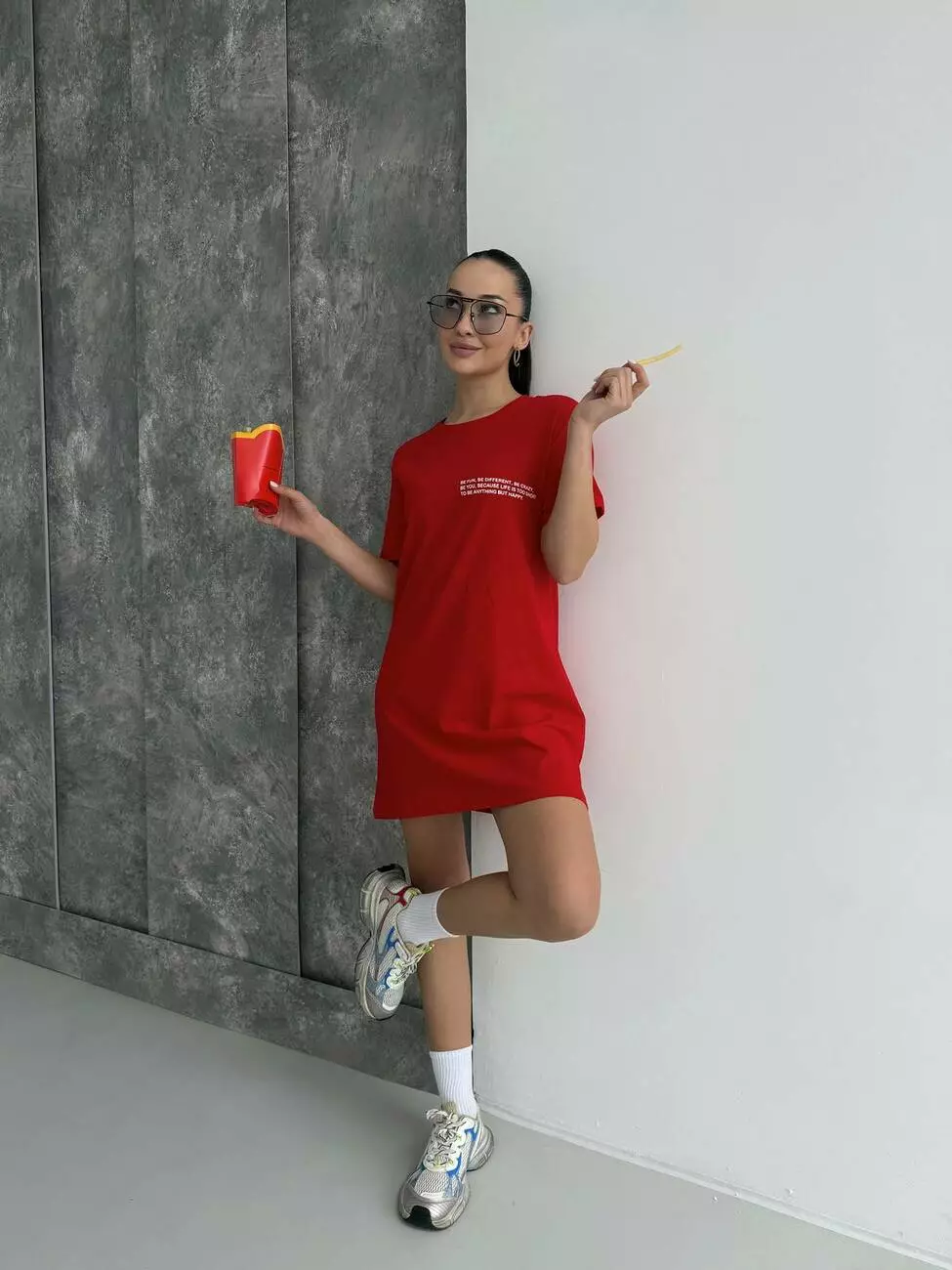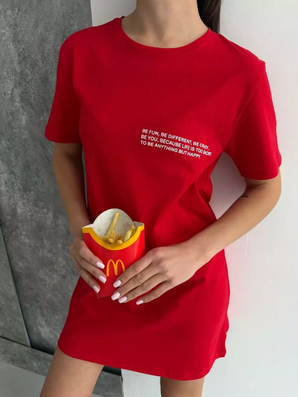 Ця футболка-туніка в ефектному червоному кольорі створена для тих, хто любить привертати увагу та випромінювати впевненість. Насичений відтінок додає енергії, а лаконічний життєстверджуючий напис на грудях заряджає позитивом і нагадує: будь щасливою кожен день!