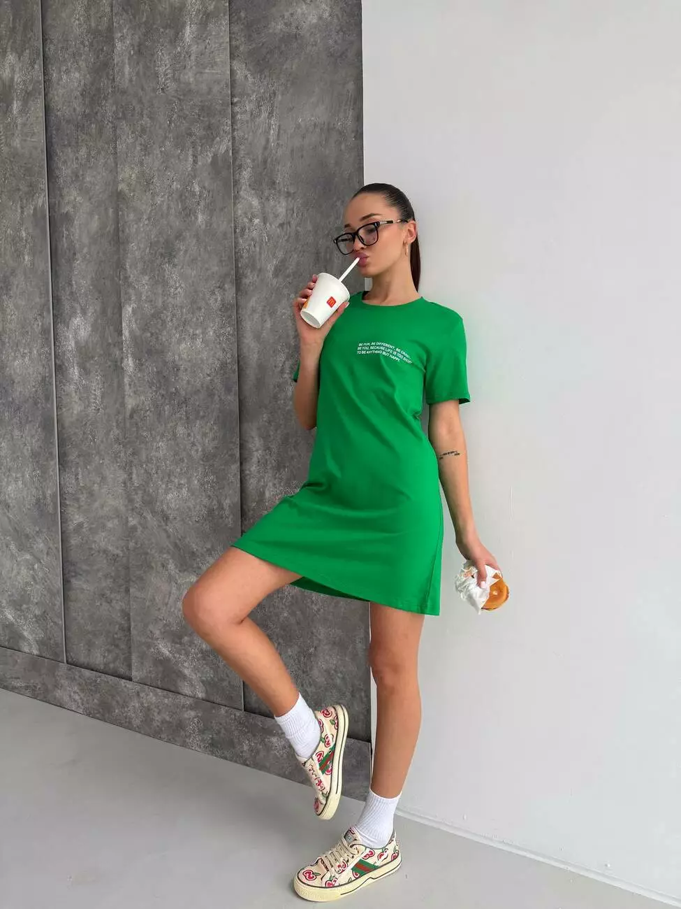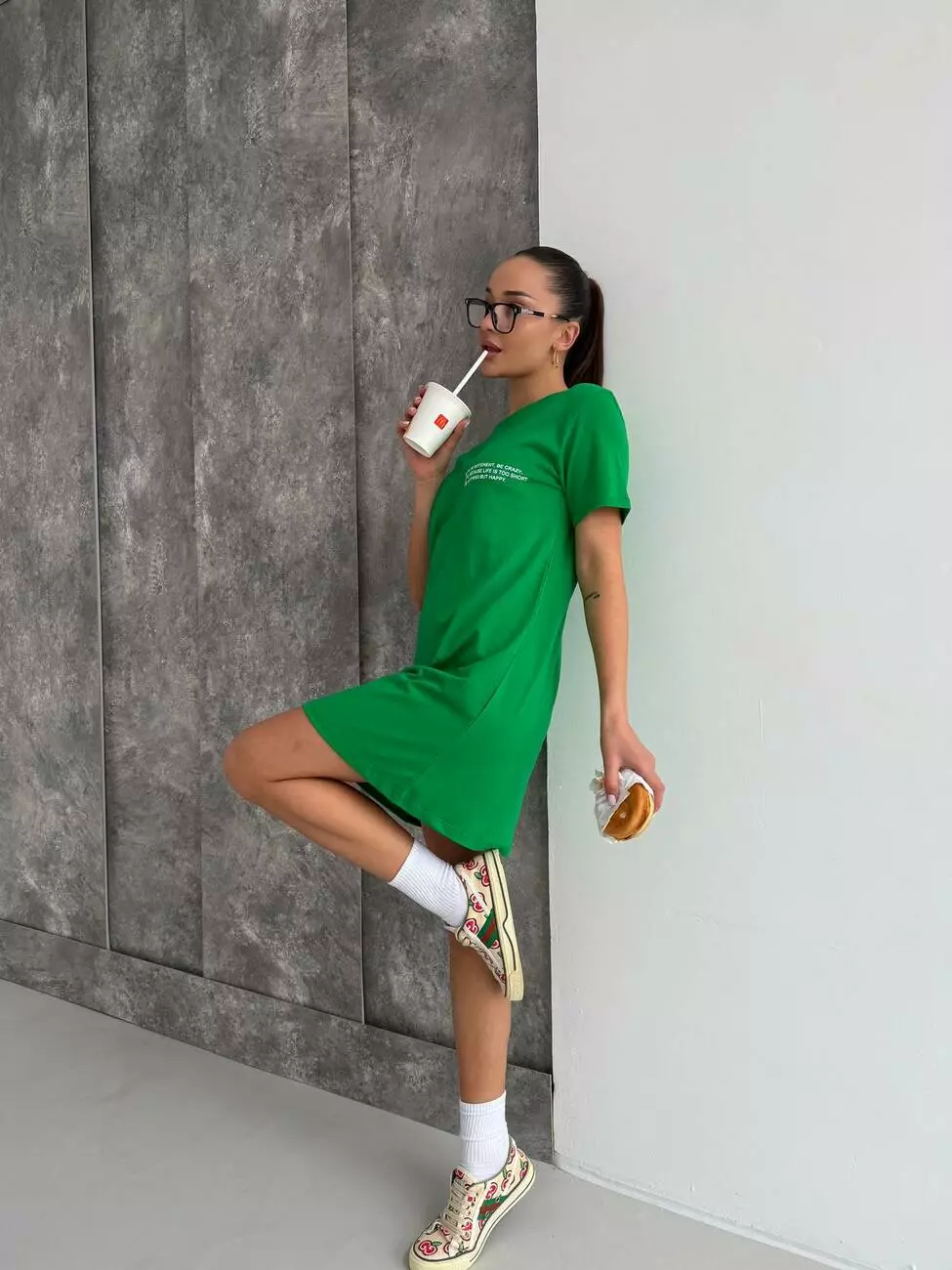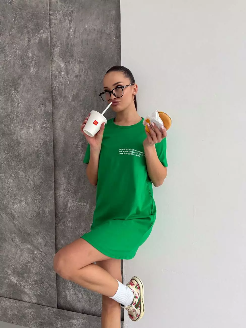 Лаконічний дизайн доповнює життєстверджуючий напис на грудях, який заряджає позитивом і нагадує: будь щасливою тут і зараз! Завдяки універсальному крою футболку-туніку можна носити вдома, на прогулянці або комбінувати з улюбленими аксесуарами для стильного і виразного образу.