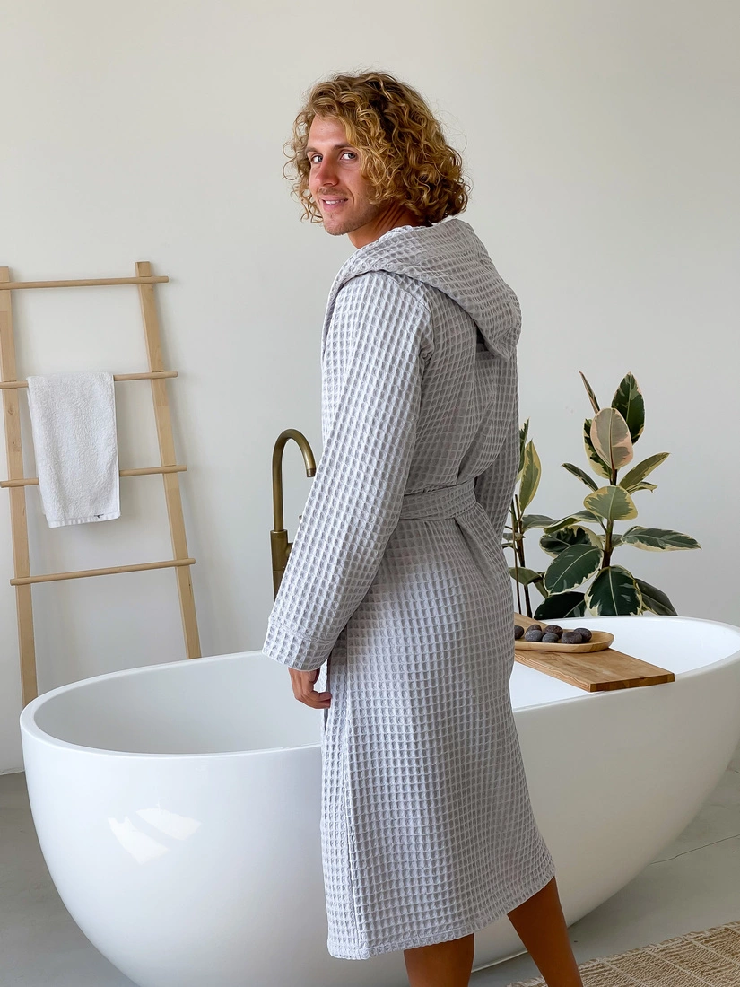 Стильний банний халат з капюшоном приємний до тіла і добре вбирає воду, його дуже приємно вдягнути після лазні або душу. Ідеальний для прохолодної пори року. Щільна та натуральна тканина допоможе швидко зігрітися. Тканина добре "дихає" і не створює парникового ефекту.