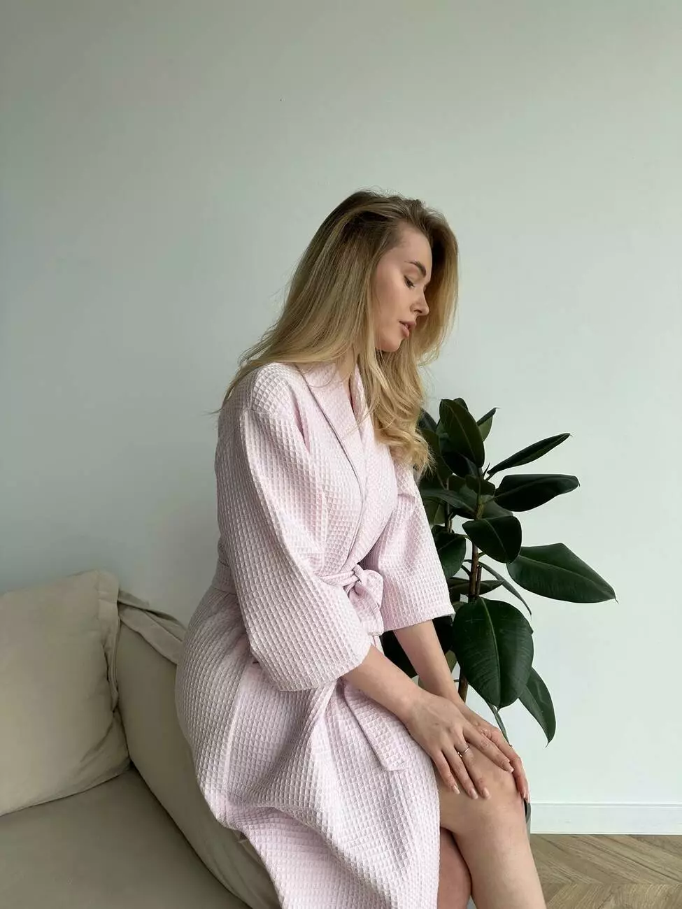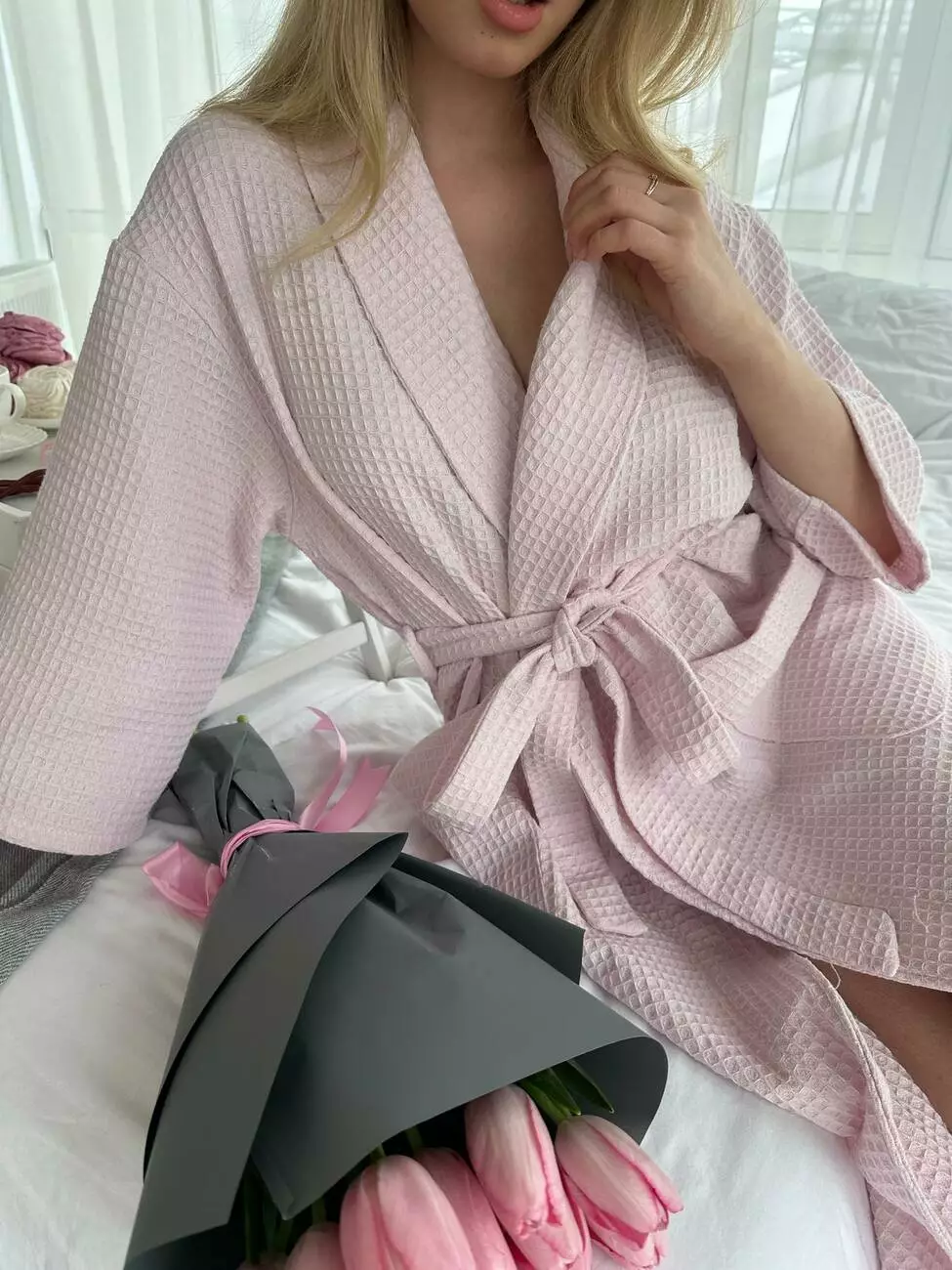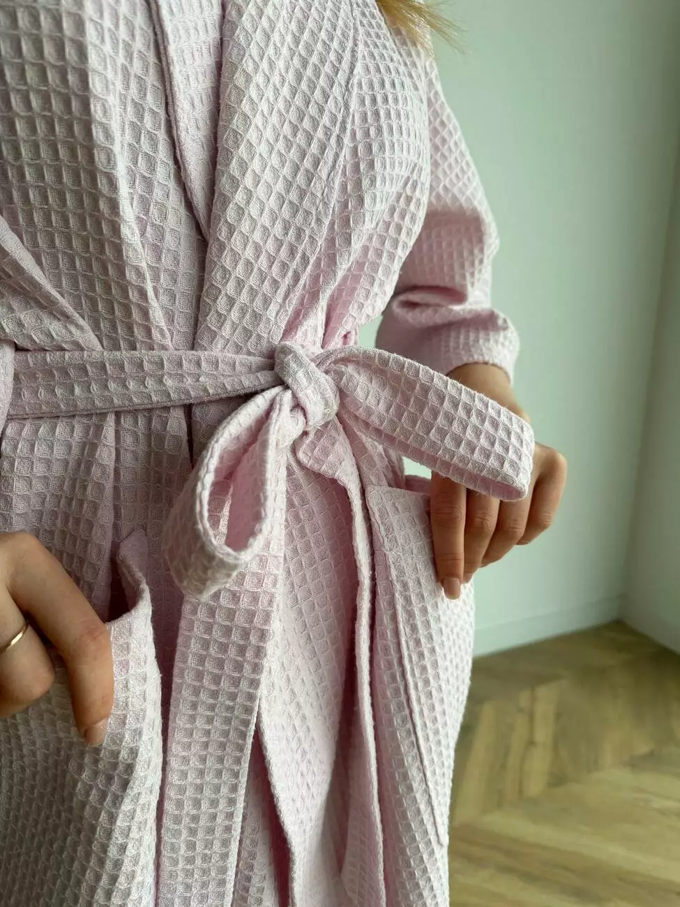 - При прасуванні використовуйте високі температури до 200°C (режим бавовна) разом із паром. Вафельні клітини можуть збиратися після прання, але після висихання та прасування вони розгладжуються, залишаючи халат ідеально оновленим.