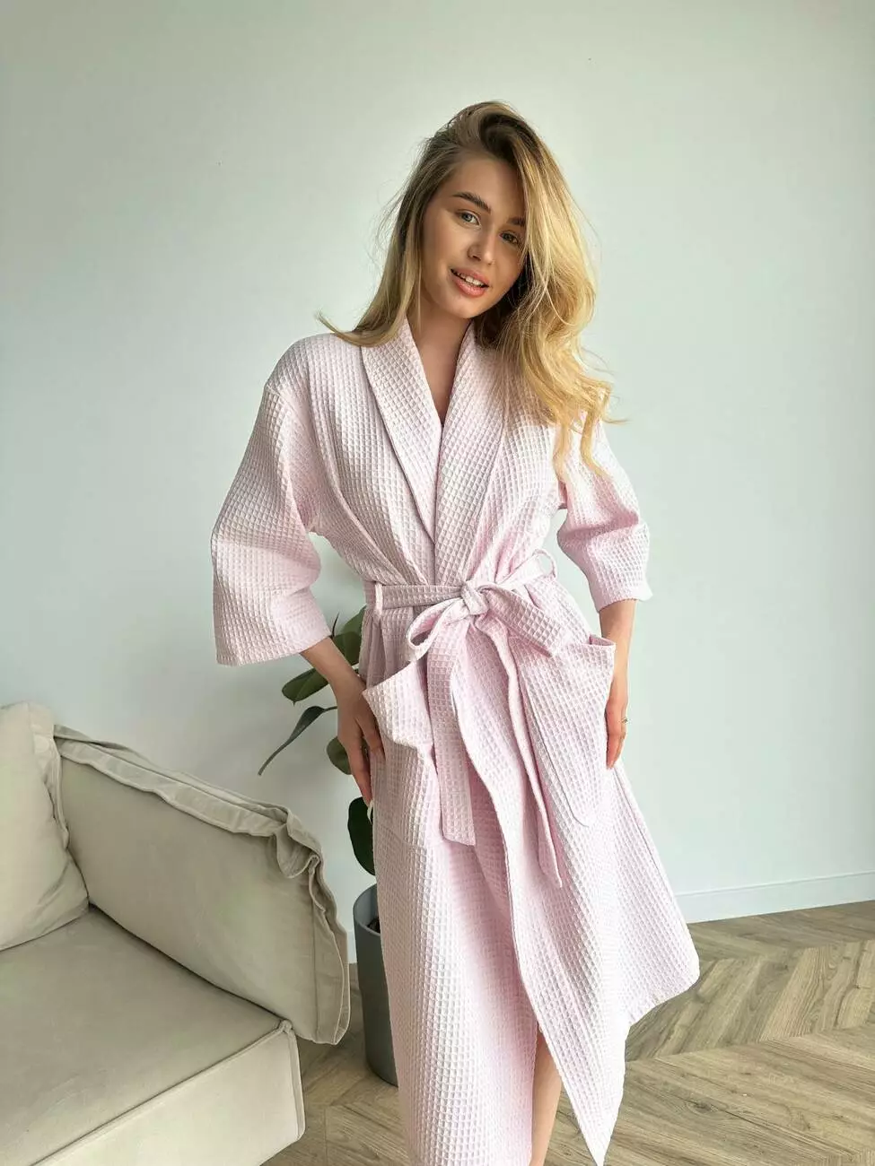 Поглибіть в світ комфорту з нашим вафельним довгим халатом із шалевим коміром. Відчуйте неперевершену м'якість та унікальну здатність поглиблювати вологу завдяки вафельній тканині, яка стала однією з найбільш популярних серед бавовняних матеріалів.