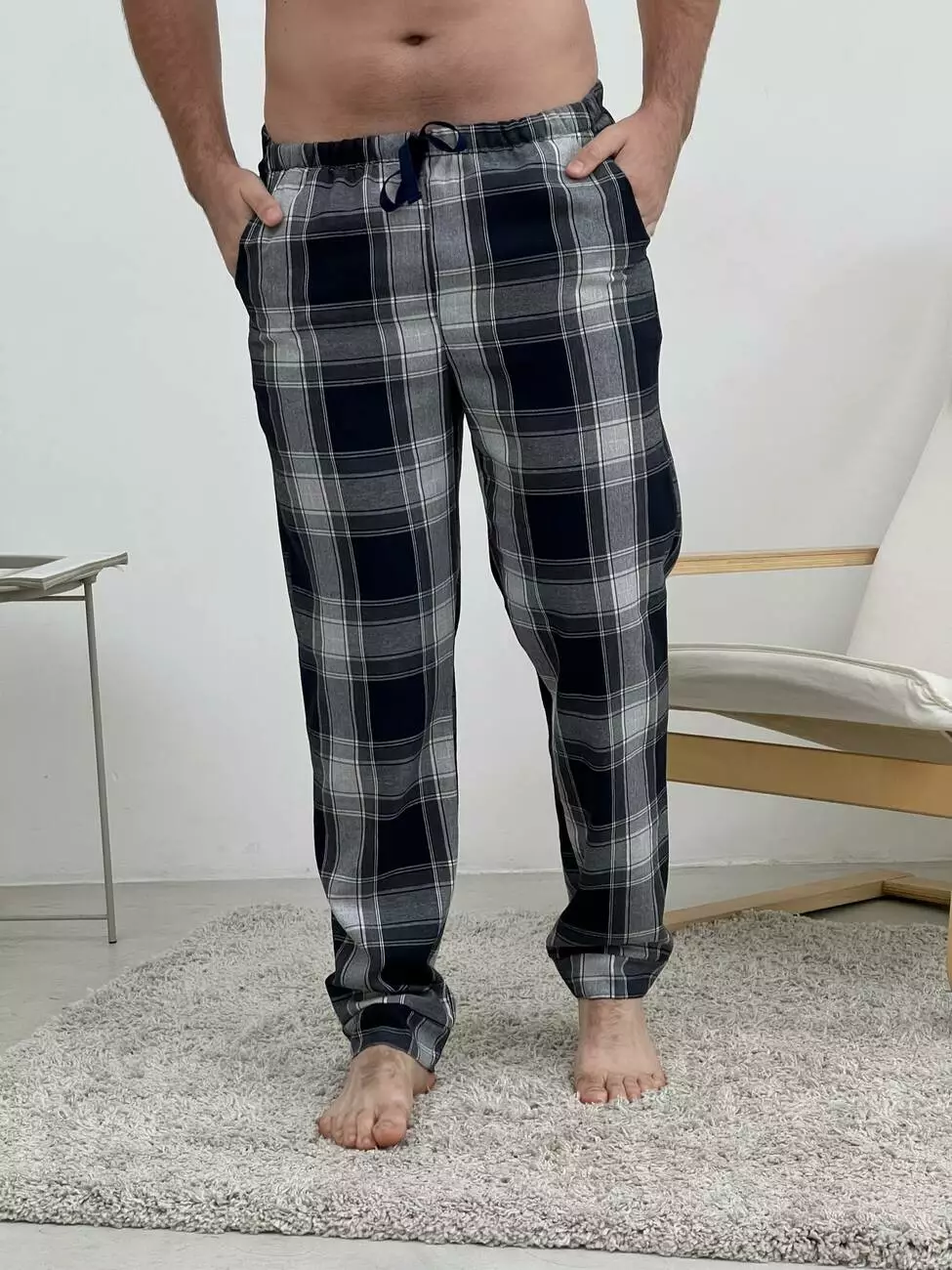 - Штани: Виготовлені з високоякісної фланелі, що складається з 70% бавовни та 30% поліестеру. Колір: темно-синя/сіра клітка. Штани мають зручні кишені та пояс на резинці з регульованою куліскою, забезпечуючи ідеальну посадку.