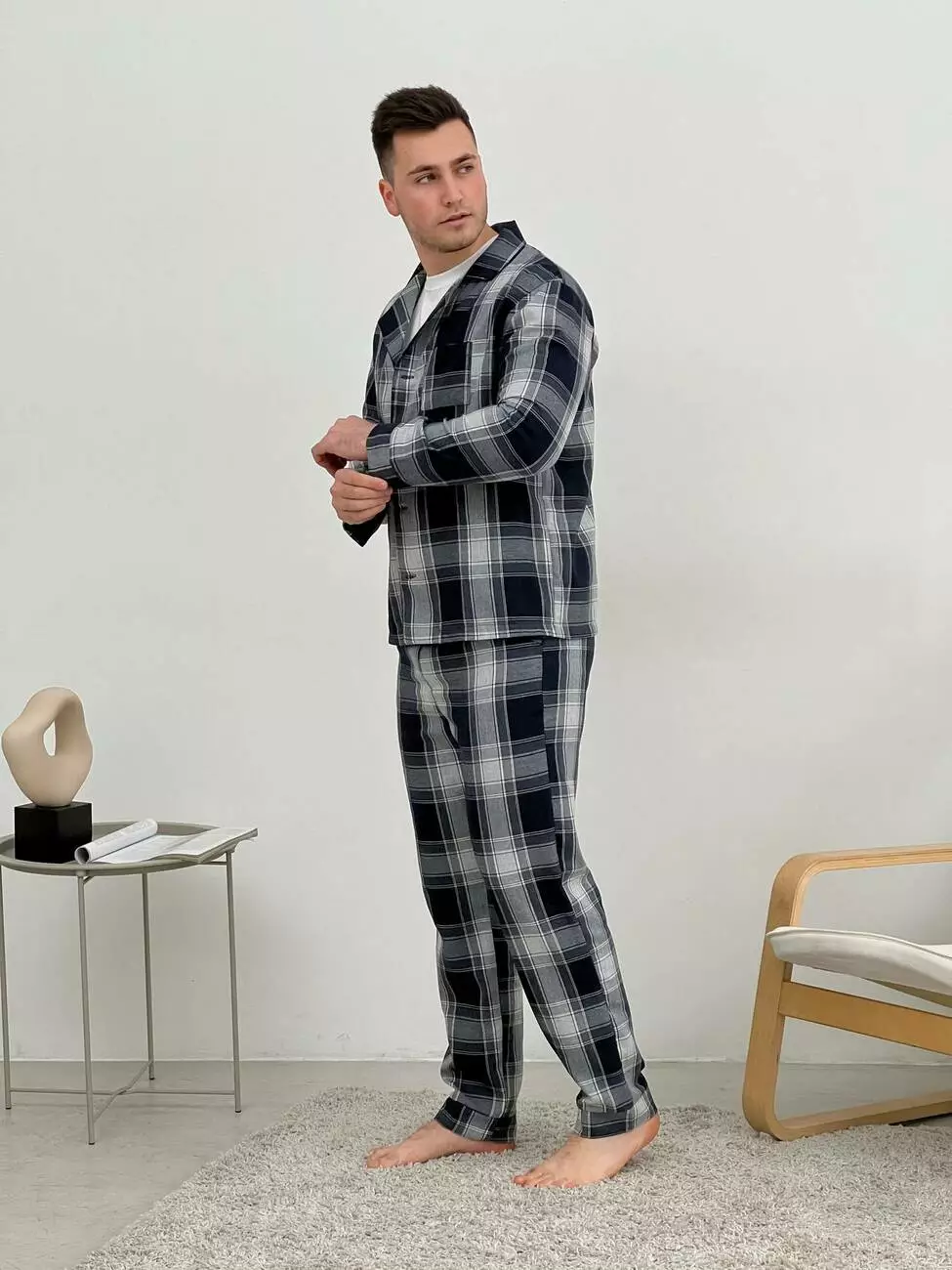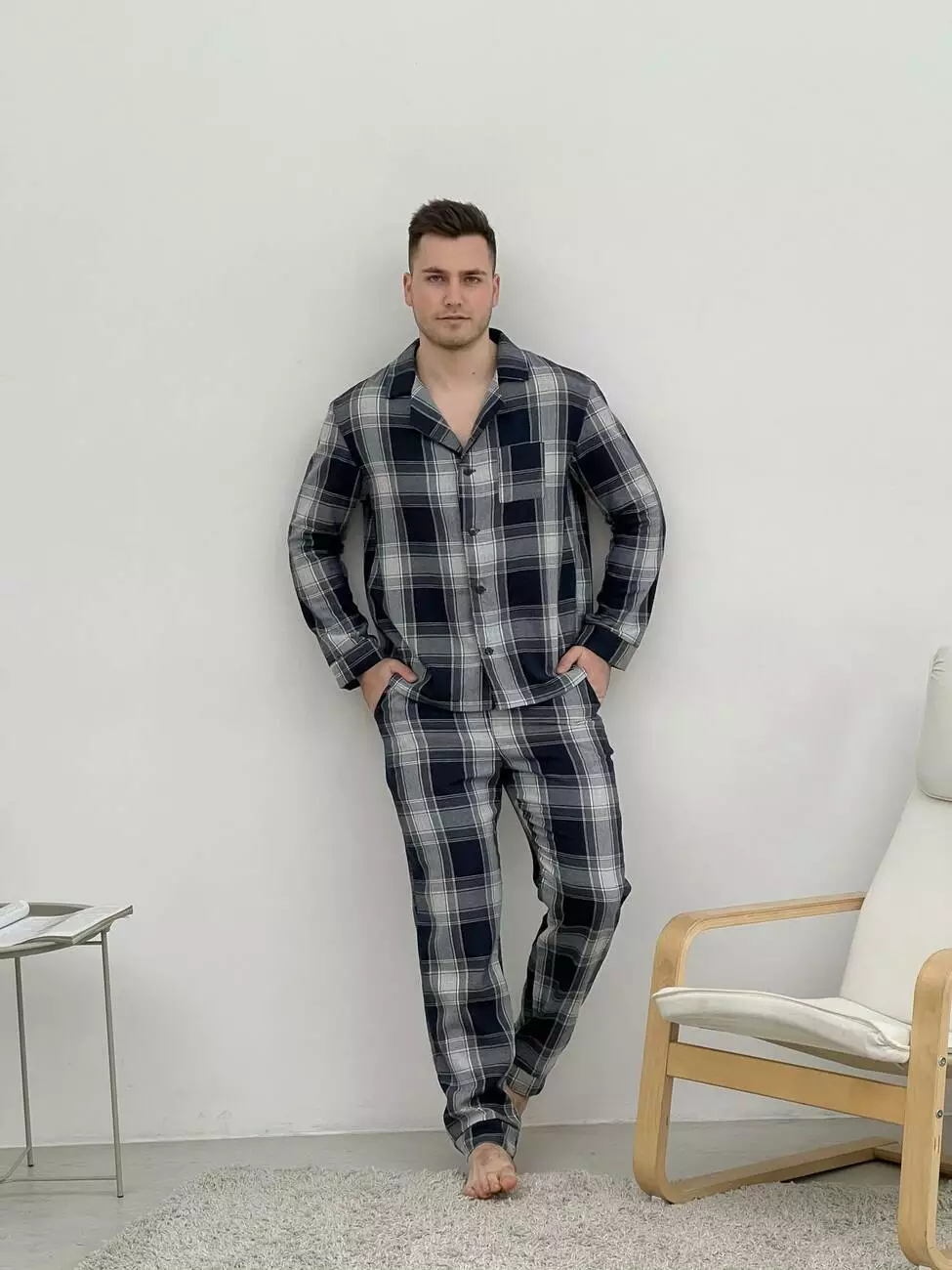 Комфортна Чоловіча Піжама - Домашній Костюм: Цей стильний та зручний комплект включає фланелеві штани та сорочку, що забезпечують максимальний комфорт і затишок у будь-який час дня.