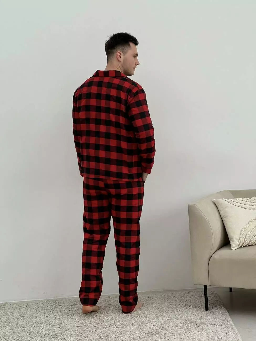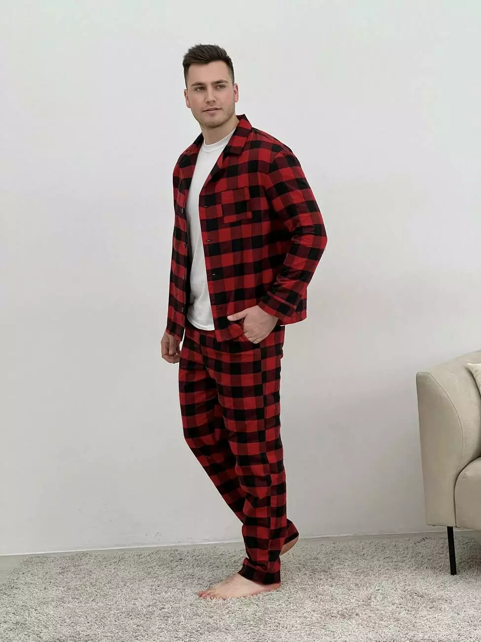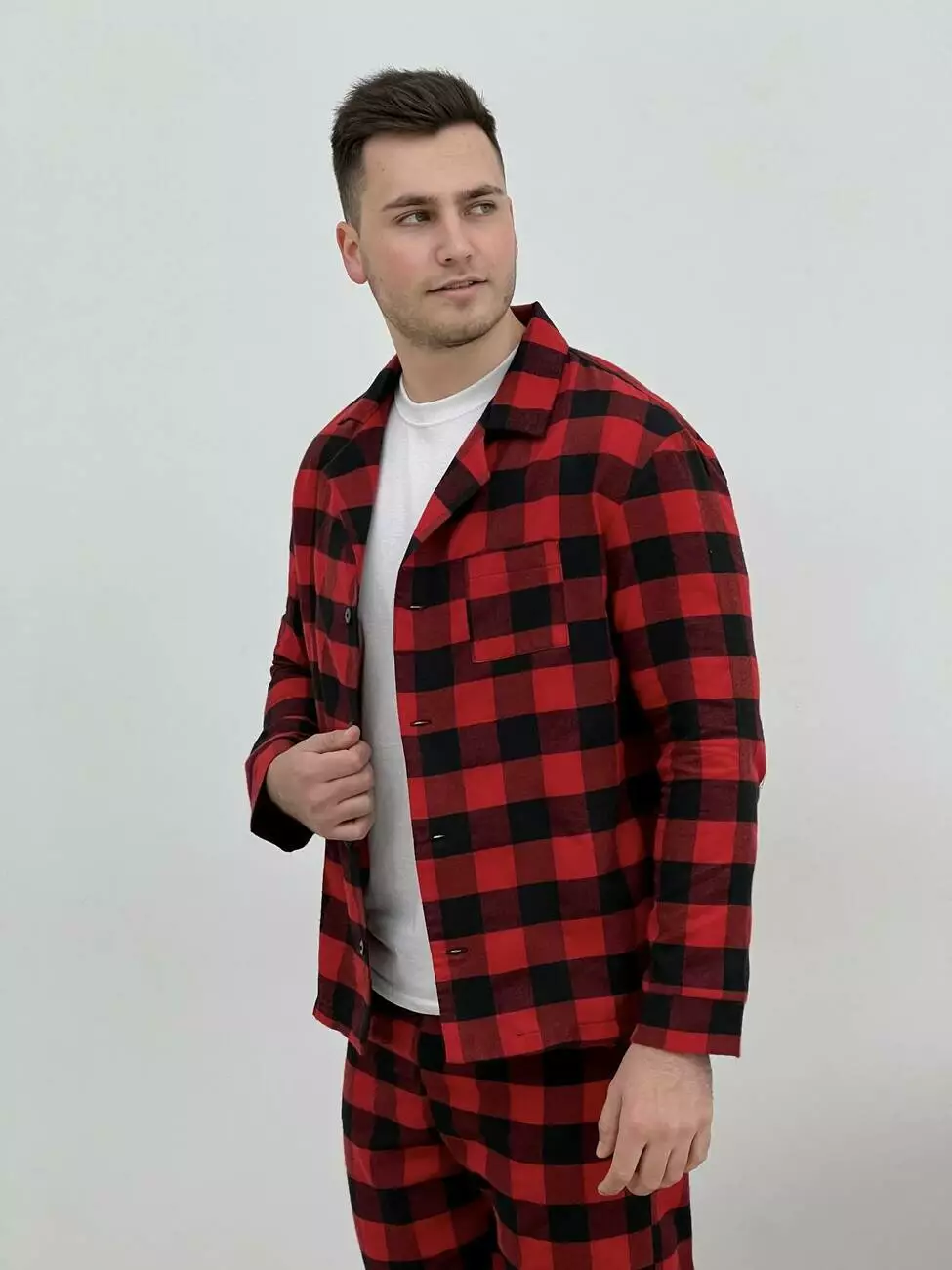 Піжама чоловіча COSY з фланелі (штани+сорочка+футболка біла) клітина червоно/чорна