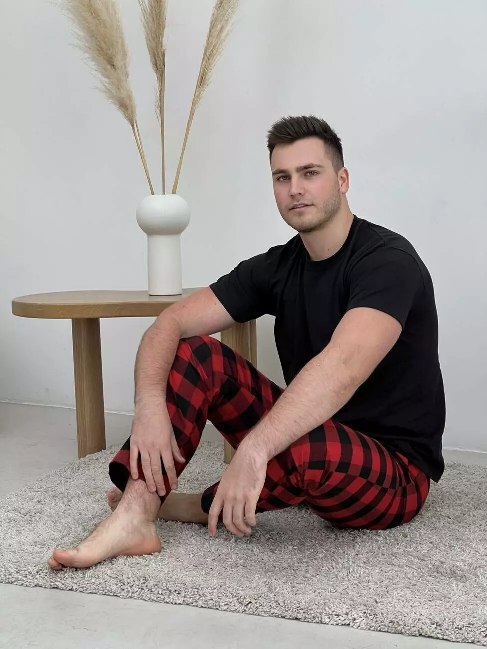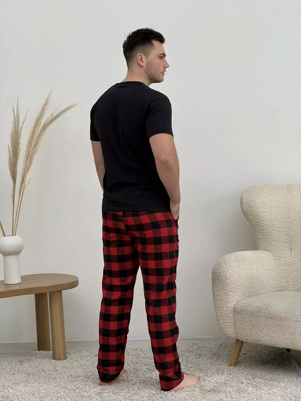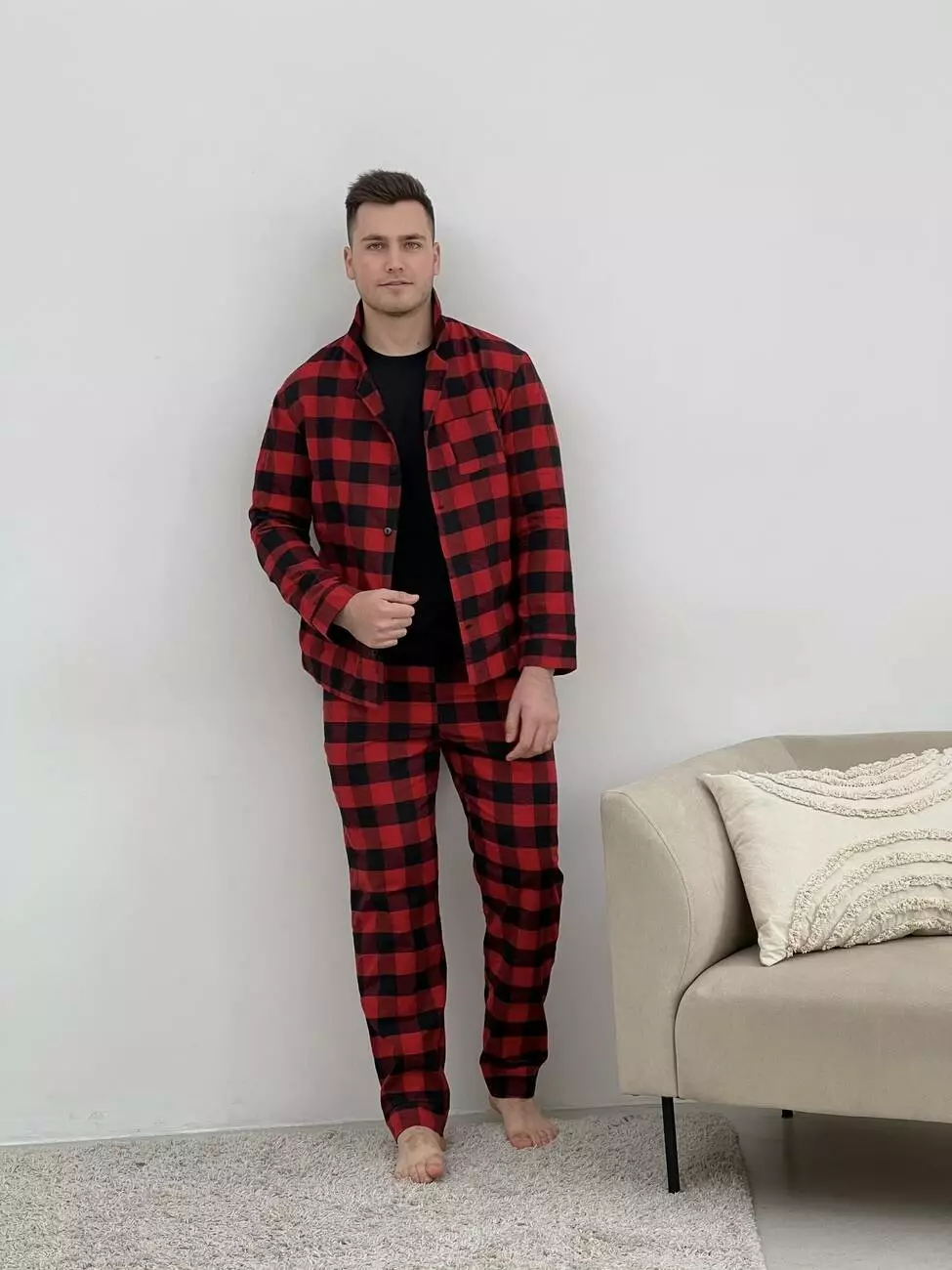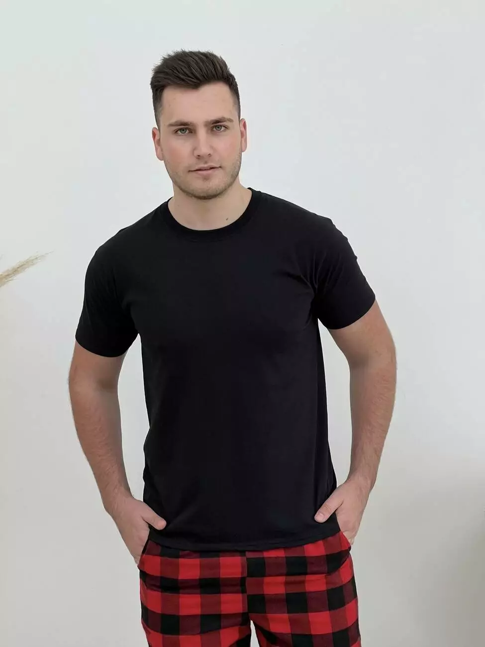 Піжама чоловіча COSY з фланелі (штани+сорочка+футболка чорна) клітина червоно/чорна