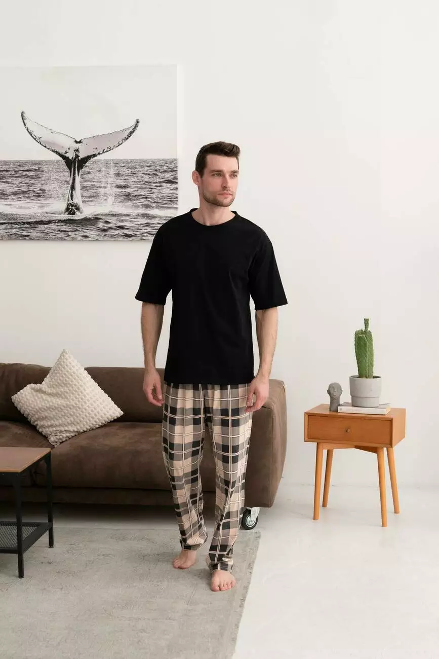 Футболка чорна, штани в клітку беж./темно-сірий.
