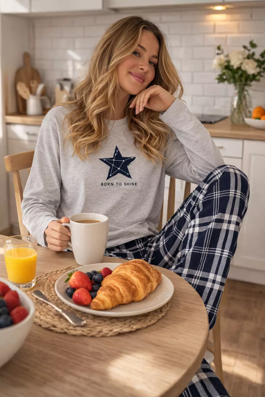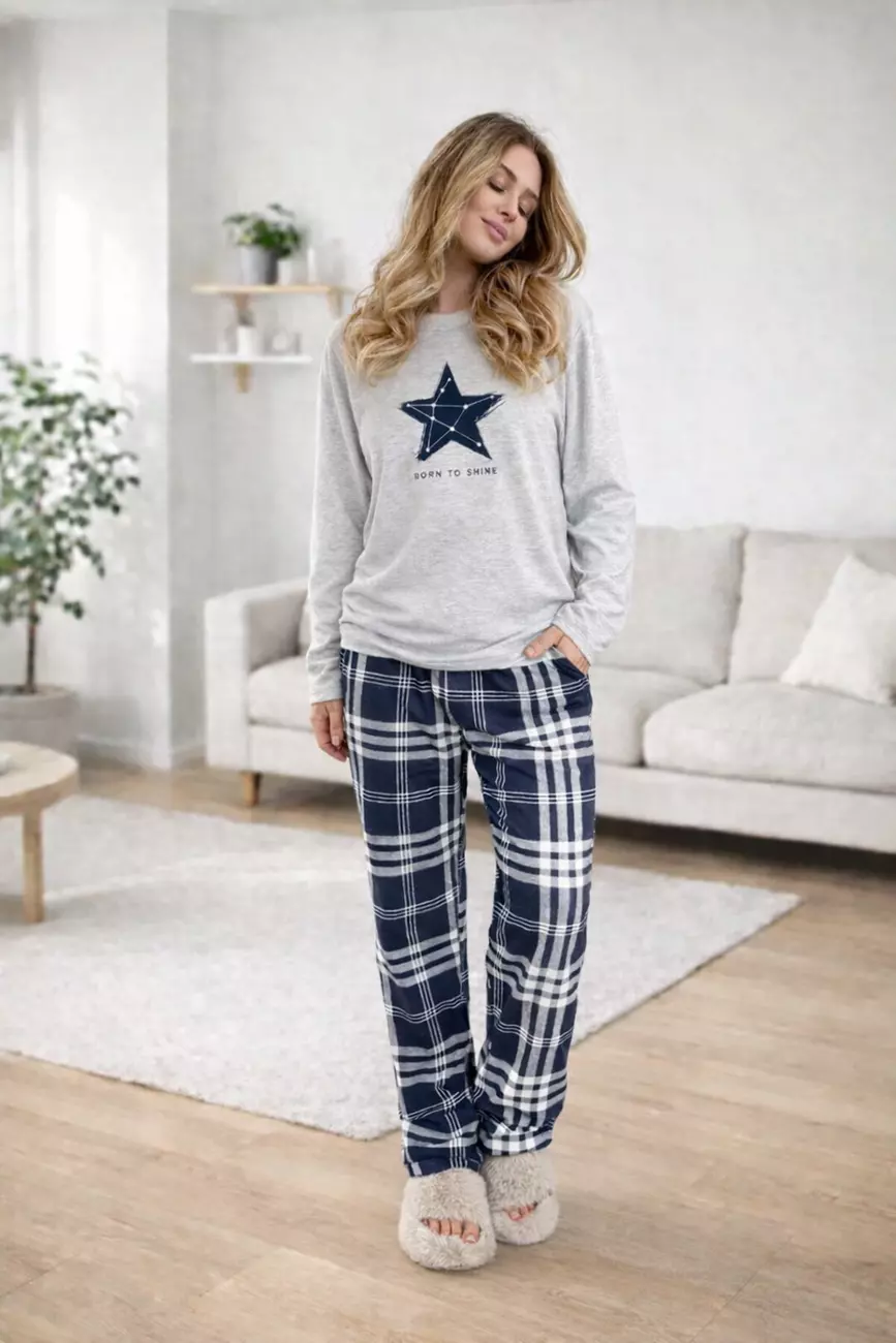 Низ: Затишні штани у класичну синьо-білу клітинку, які додають образу домашнього тепла та гармонії.