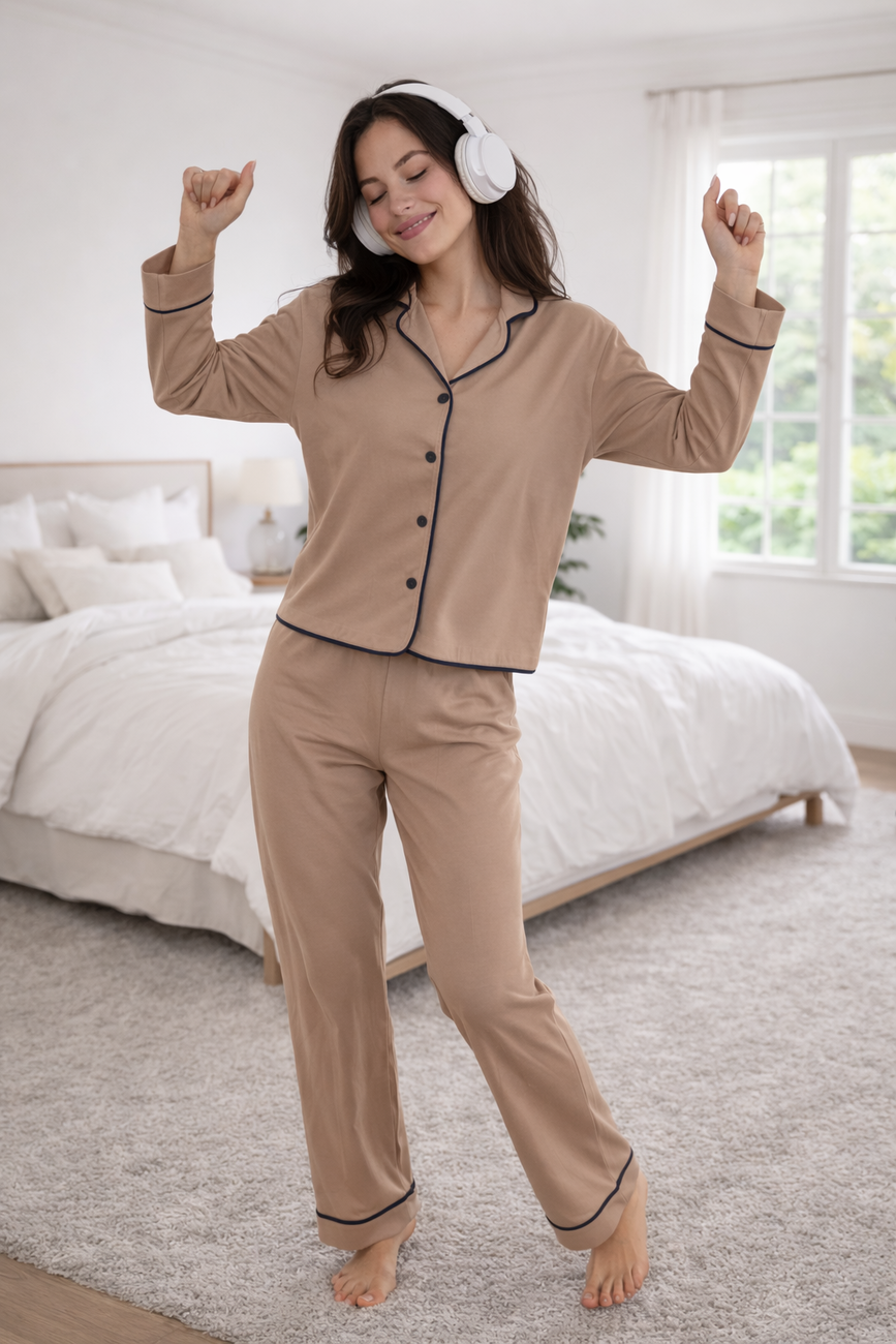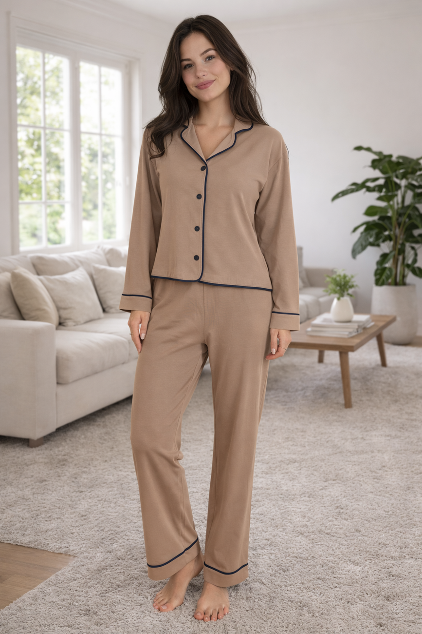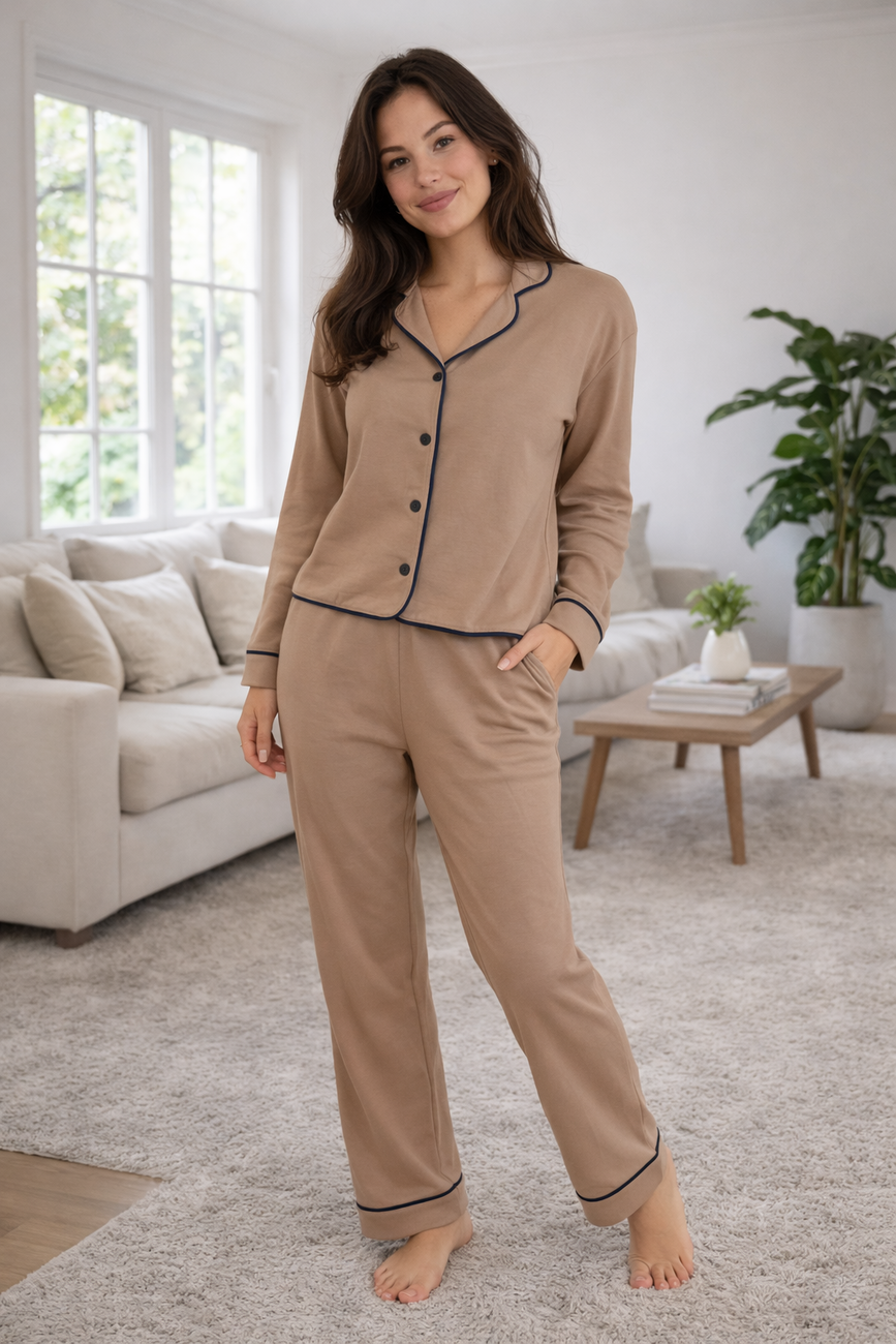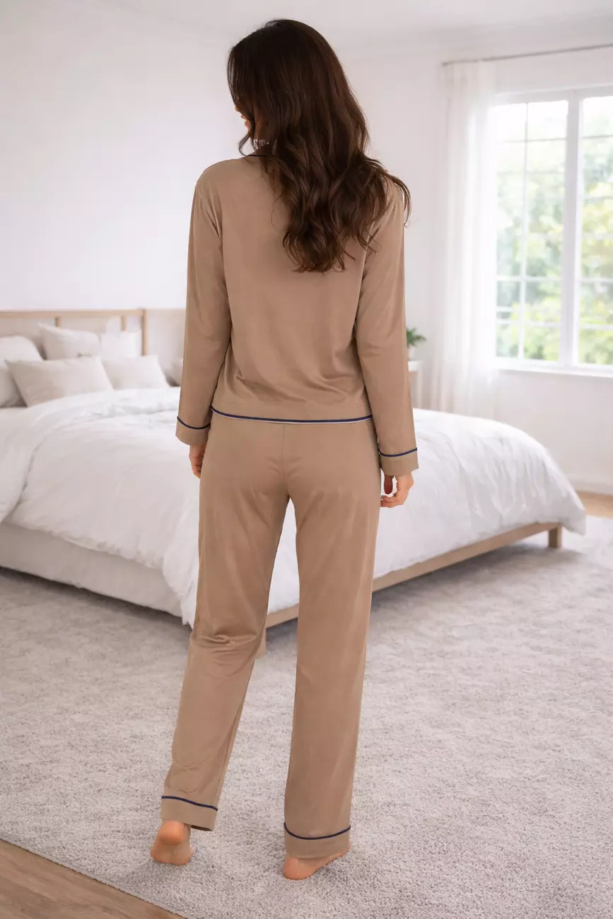 Деталі: Елегантне оздоблення контрастним кантом додає виробу структурованості, перетворюючи піжаму на стильний домашній костюм.