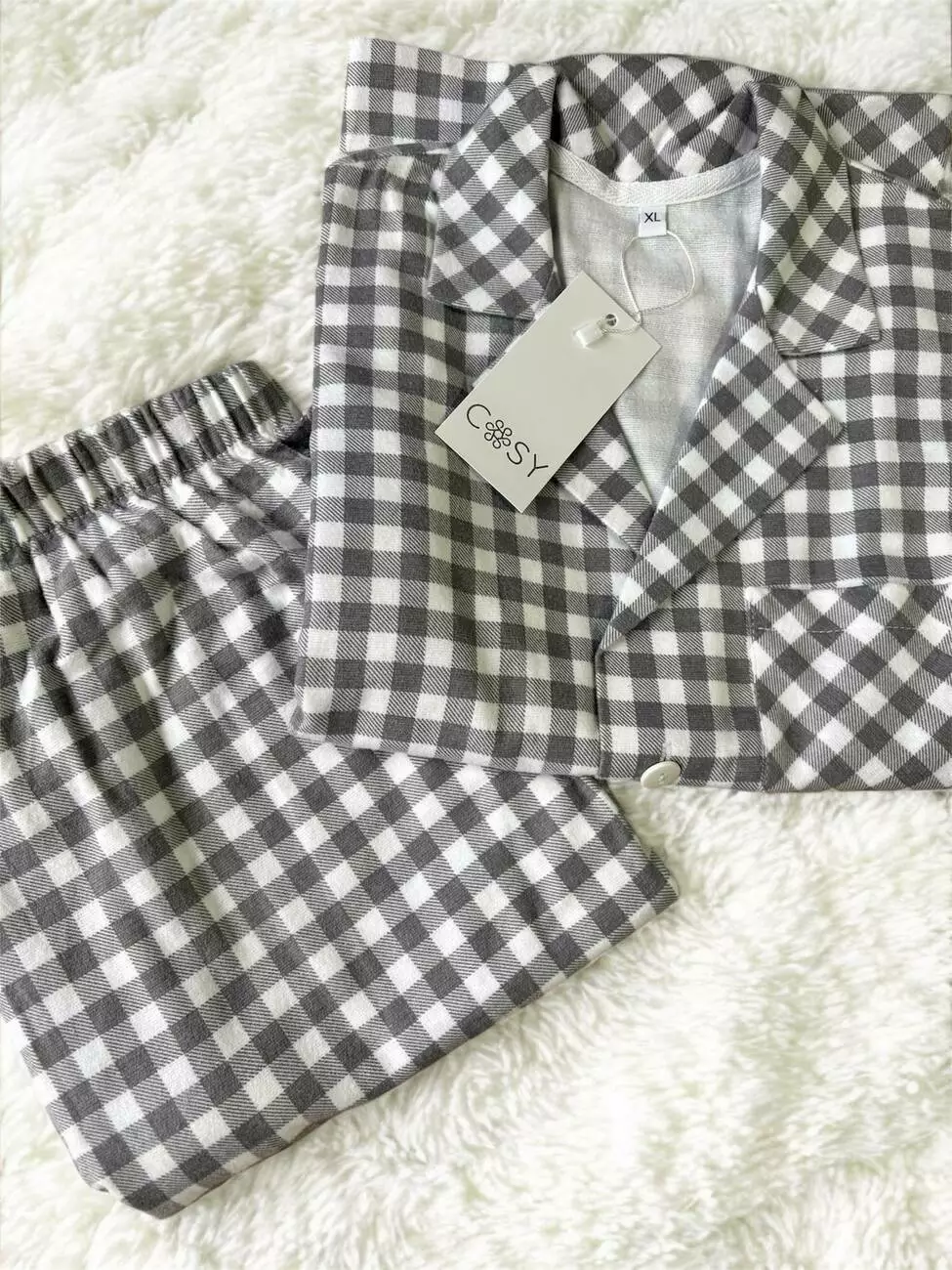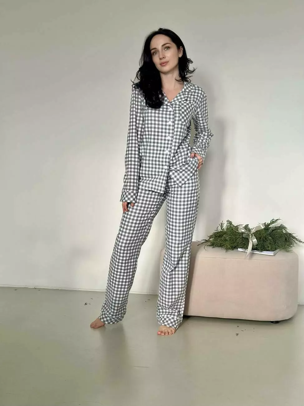 М’яка фланель у стильну сіро-білу клітинку дарує відчуття турботи, спокою та приємного релаксу після насиченого дня.