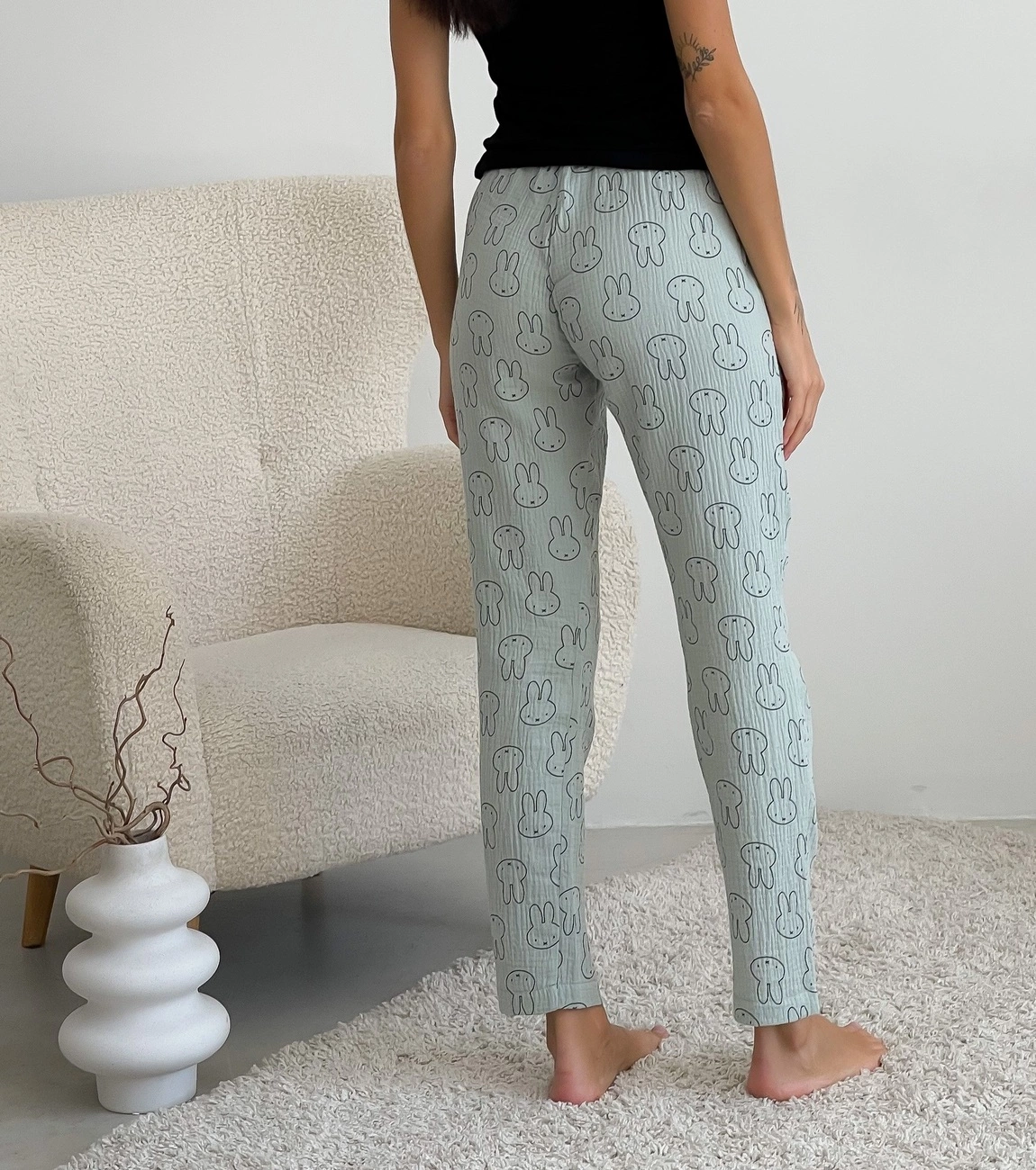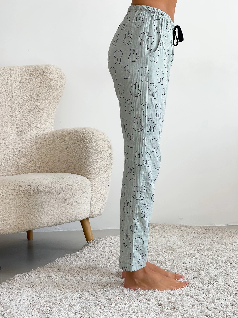 М'які муслінові піжамні штани із зайчиками додадуть яскравості домашньому образу. У них можна комфортно проводити час вдома або піти спати. Натуральна тканина приємна та комфортна тілу.