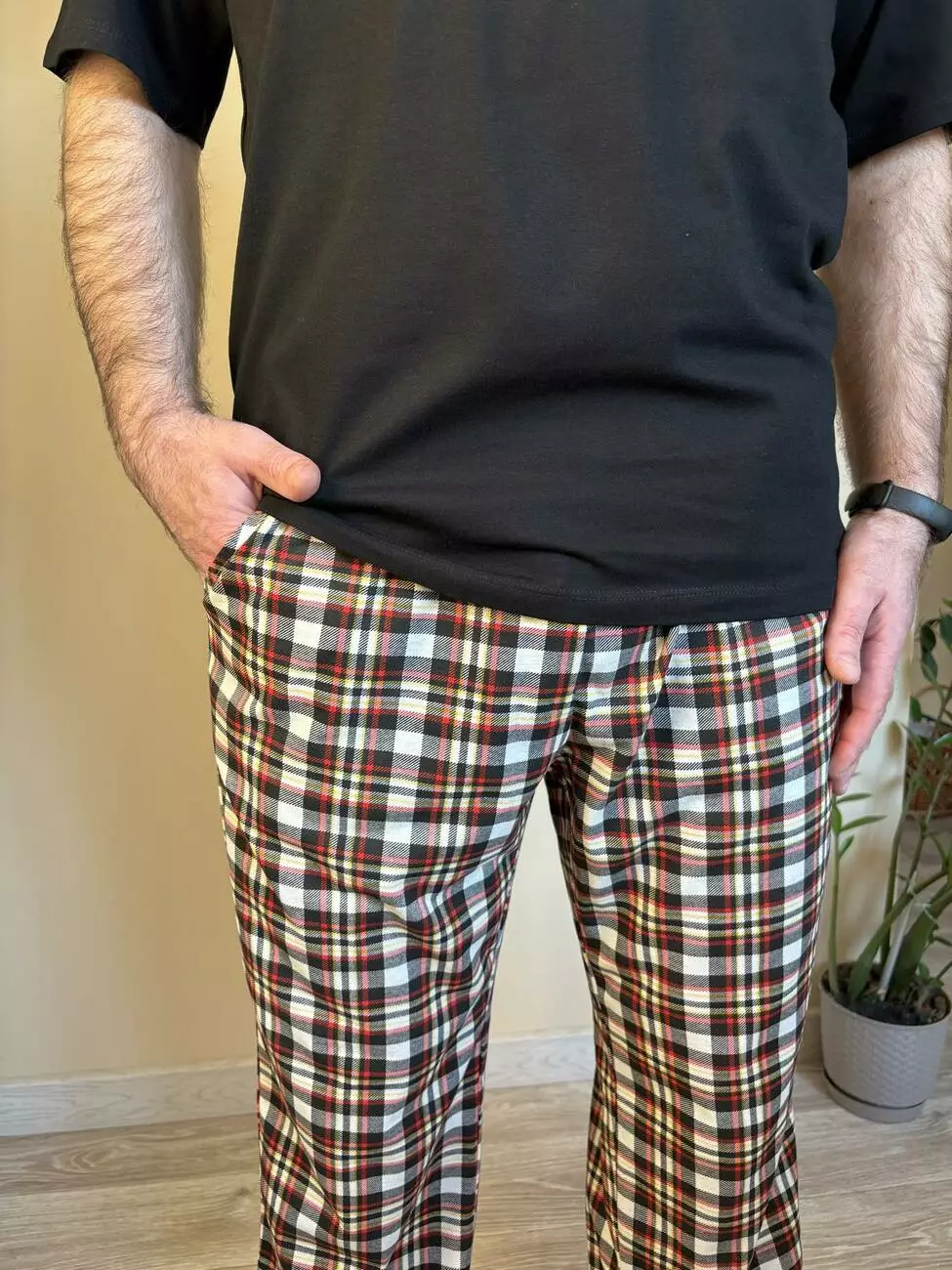 Штани – в стильну клітинку, на м’якій резинці, з кишенями для зручності.