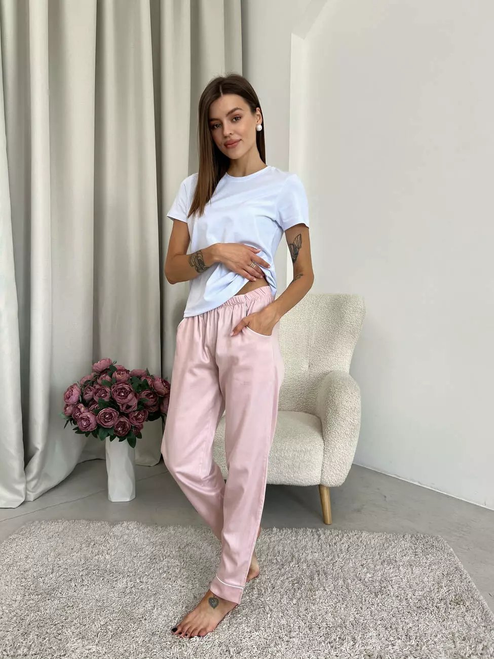 Піжамний комплект COSY жіночі штани з сатину Pearl пильна пудра з білою футболкою