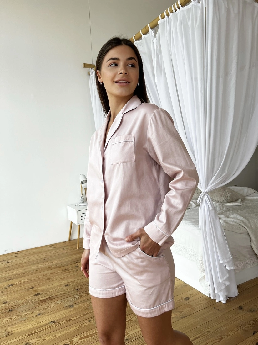 Піжамний жіночий комплект COSY 2-ка з сатину (сорочка+шорти) Pearl пильна пудра