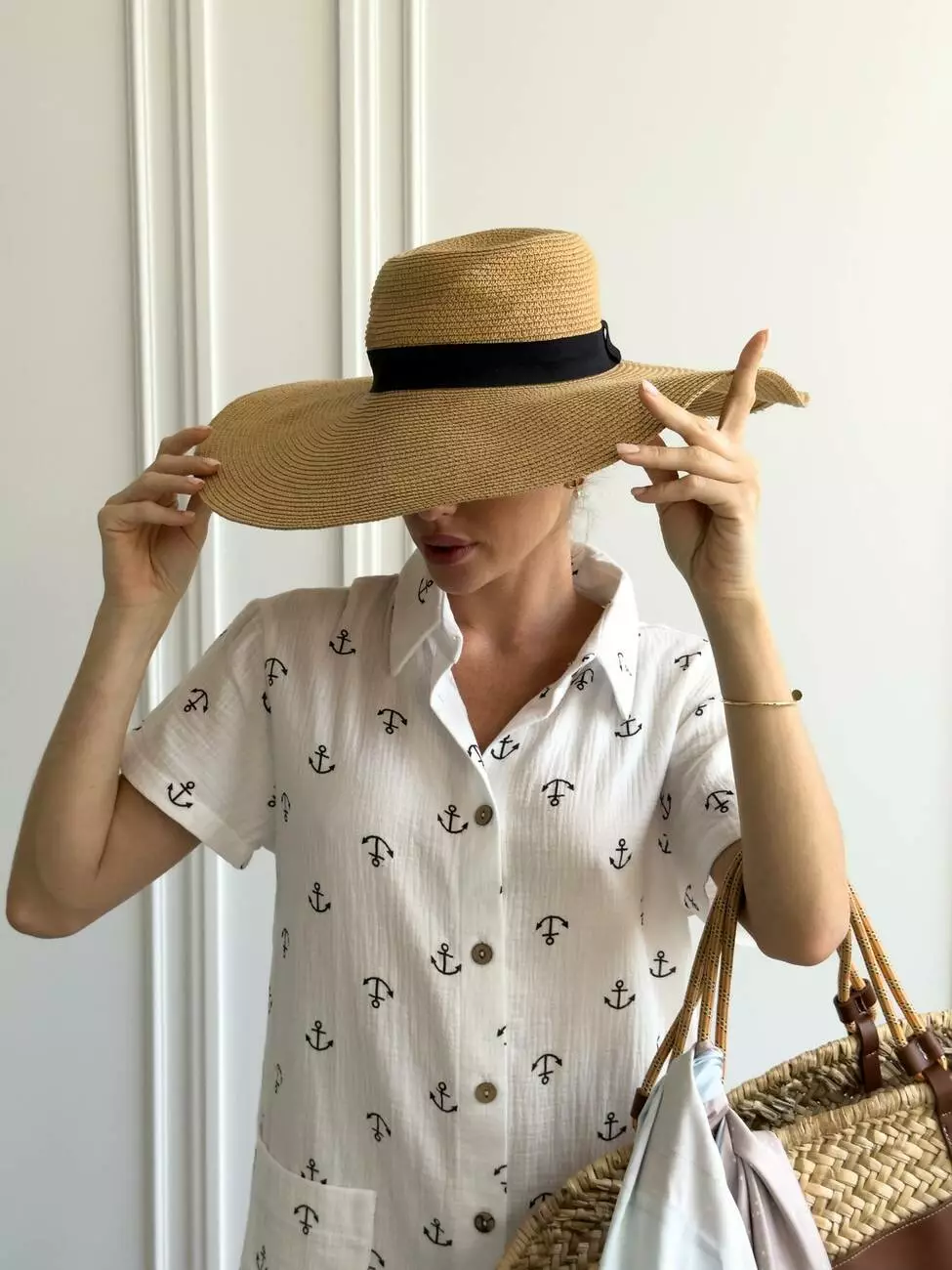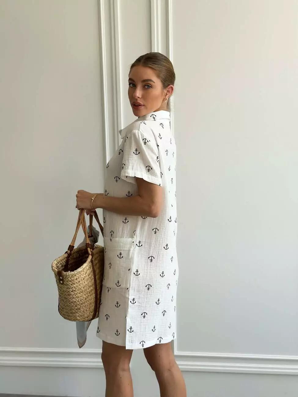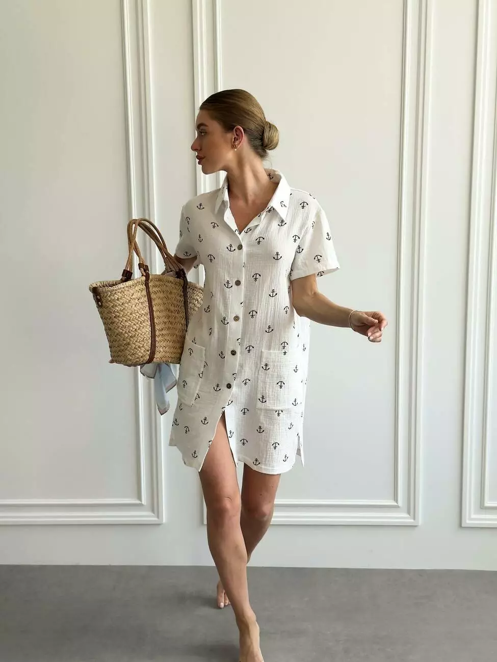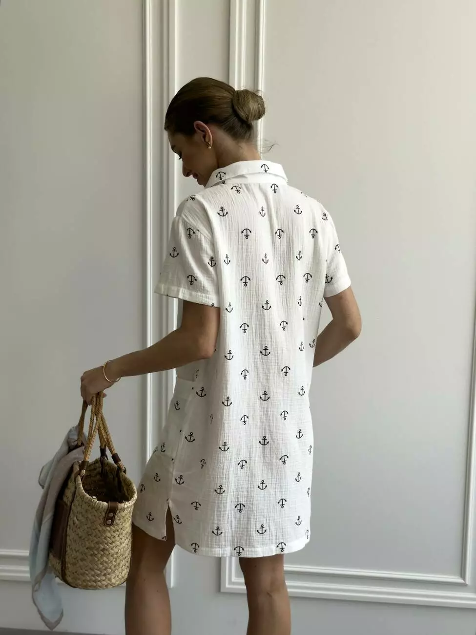 Завдяки легкому, дихаючому матеріалу, вона забезпечує приємну прохолоду та комфорт у найспекотніші дні. Стильний морський принт із якорями додає особливого шарму та нагадує про літній відпочинок.