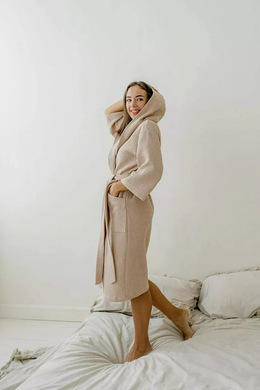 Одягніть зручність та елегантність з цим жіночим вафельним халатом з капюшоном у ніжному відтінку беж. Вафельна тканина, завдяки своїй м'якості та унікальній здатності поглибленого вбирання вологи, стає не лише популярною, але й невід'ємною частиною вашого гардеробу.