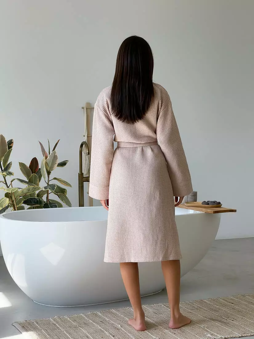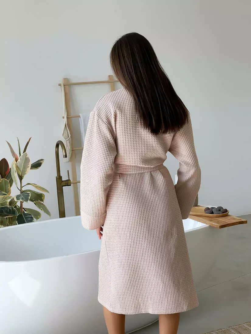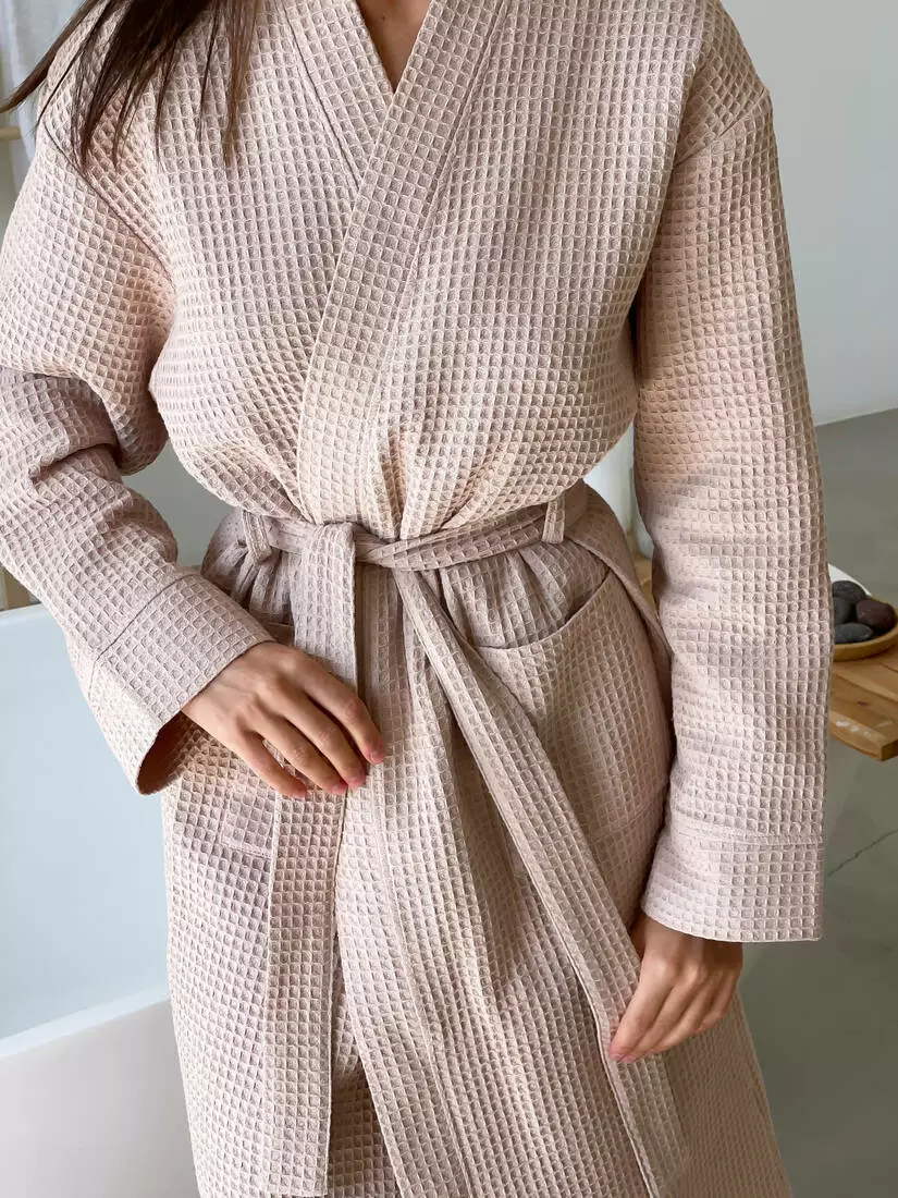 Дайте своєму гардеробу новий рівень комфорту з нашим зручним довгим халатом, який ставить на перший план м'якість та властивість поглиблення вологи вафельної тканини – справжньої перлини серед бавовняних матеріалів.