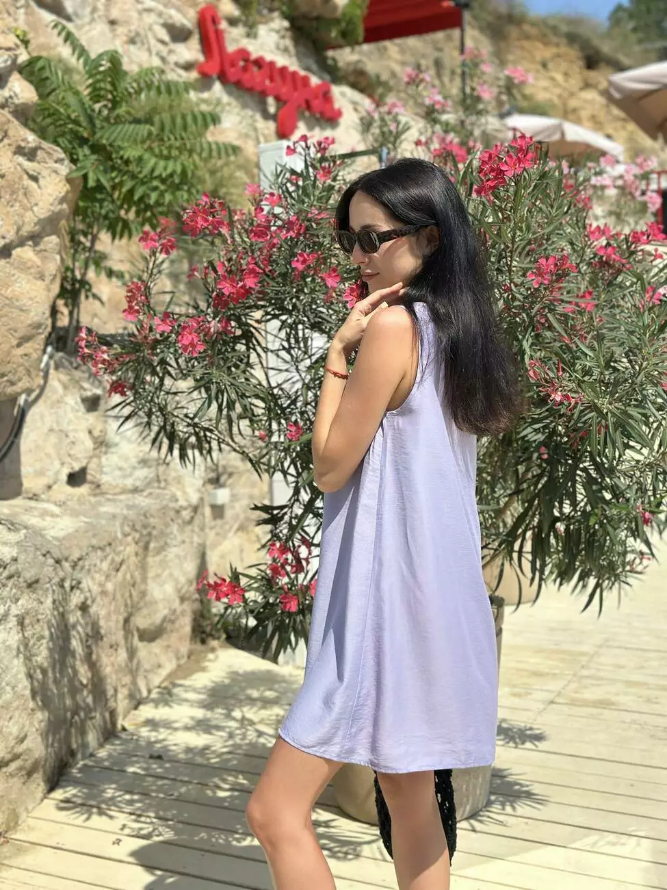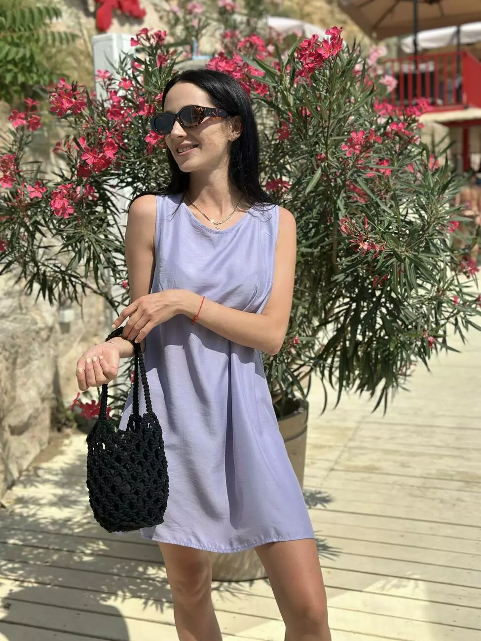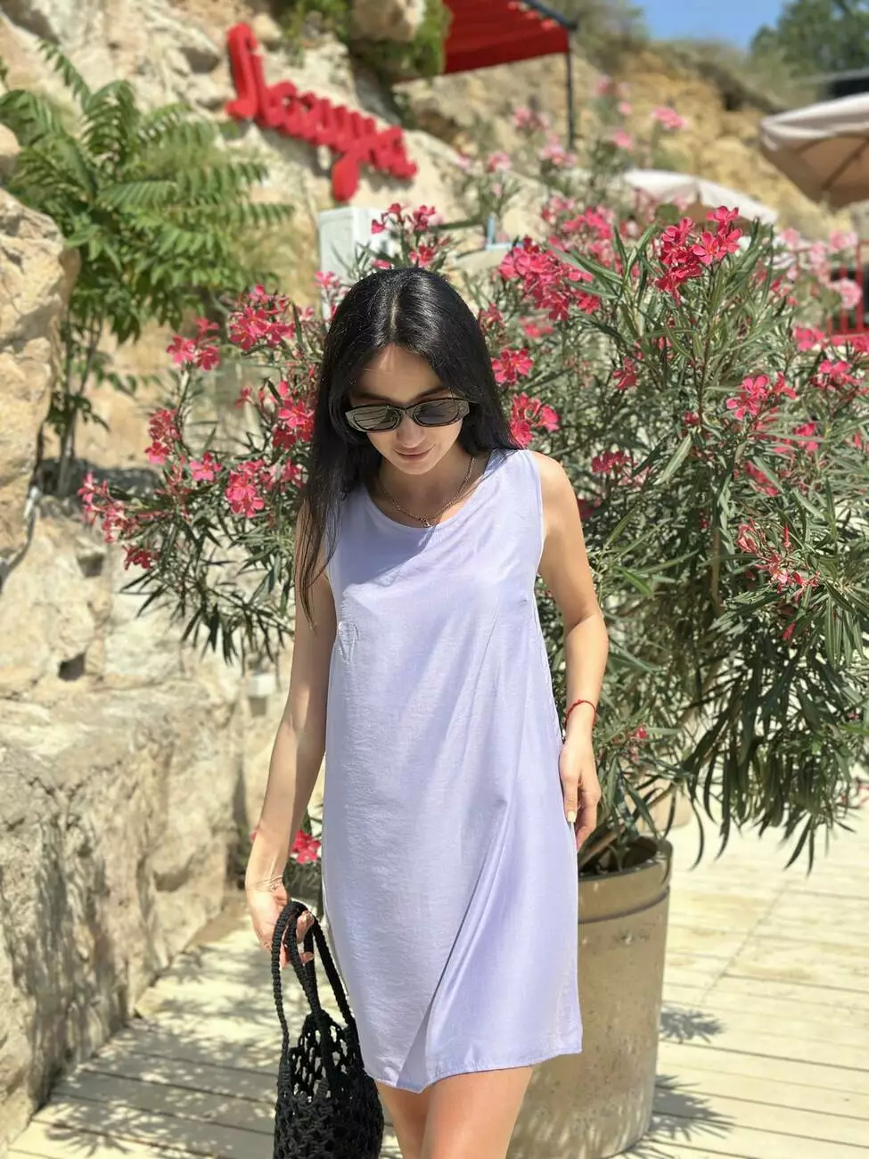 Коротка довжина (вище коліна) додає грайливості, а вільний крій забезпечує максимальний комфорт навіть у спеку. Лавандовий відтінок виглядає свіжо та жіночно, гарно підкреслює засмагу й поєднується з білими, молочними або бежевими аксесуарами.