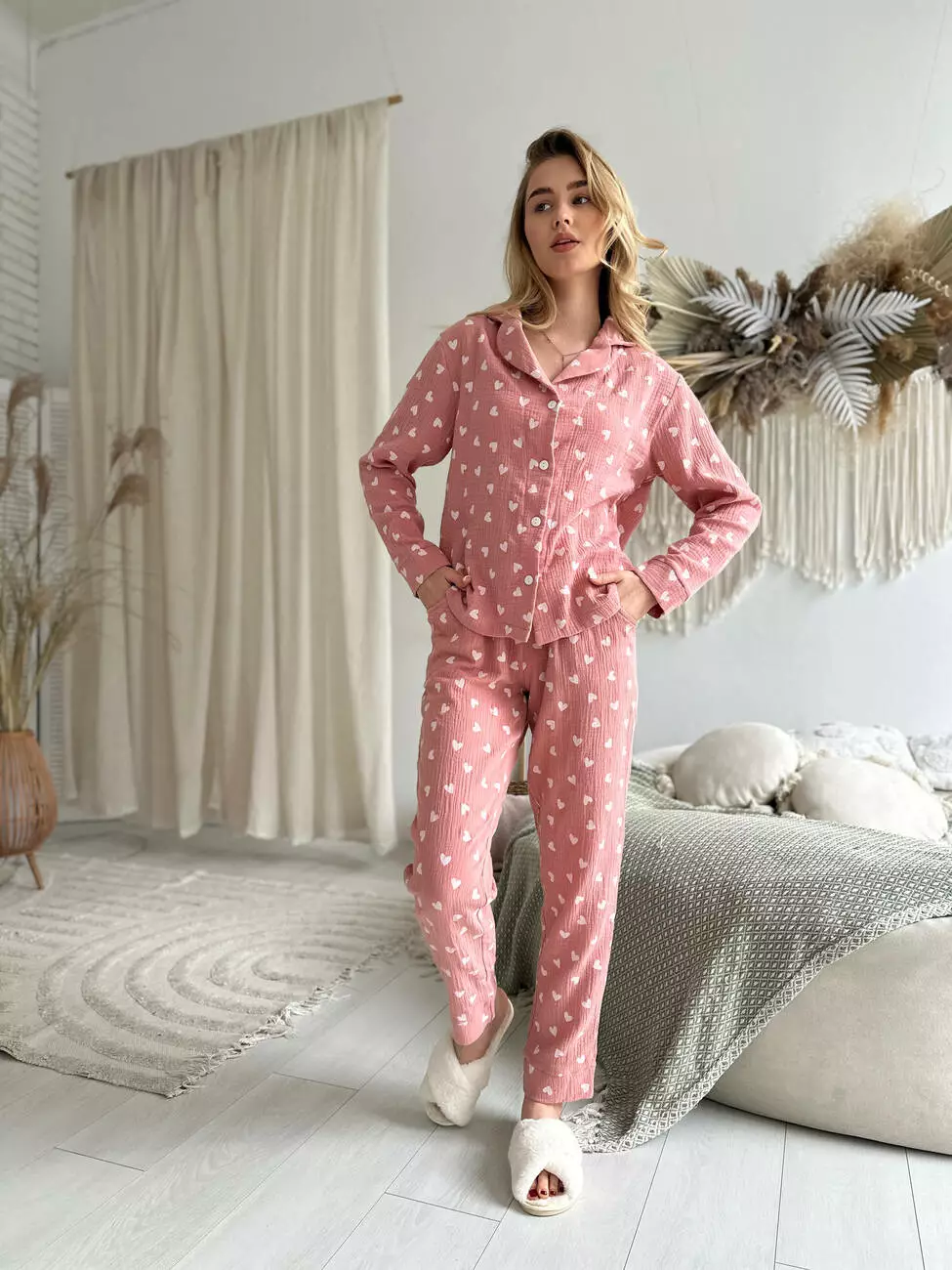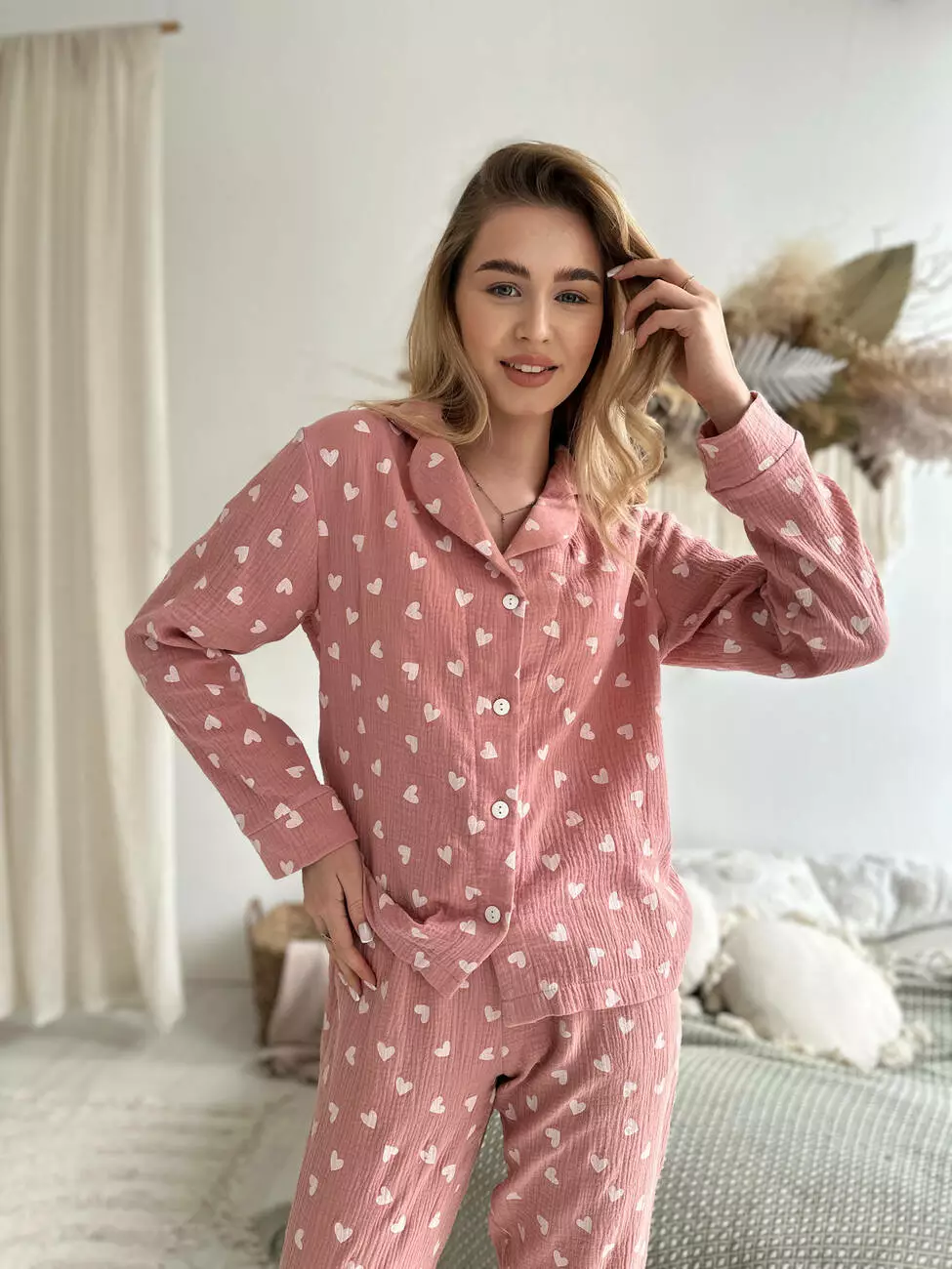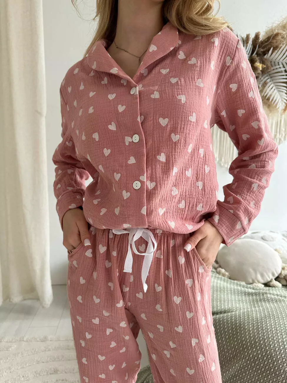 Жіноча Муслінова піжама COSY Серця (темна пудра) штани+сорочка