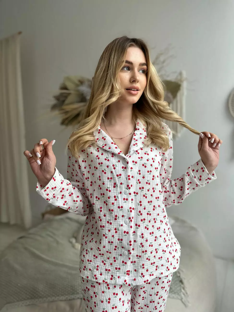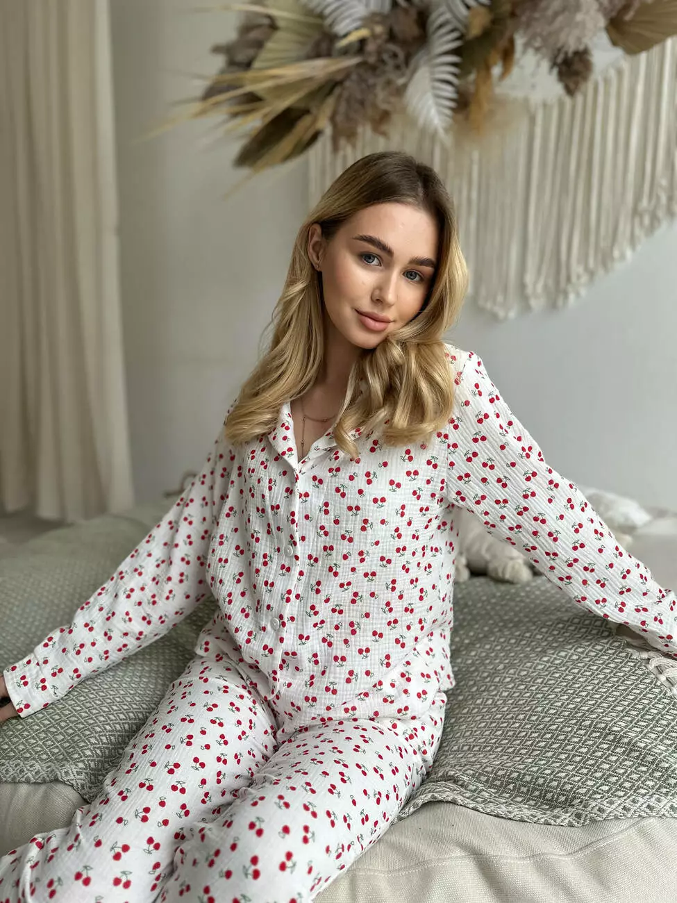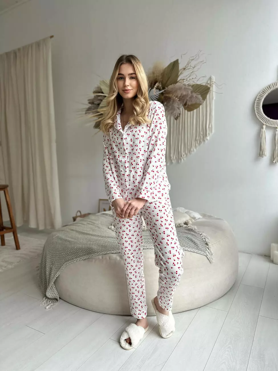 Жіноча Муслінова піжама COSY вишеньки на білому штани+сорочка