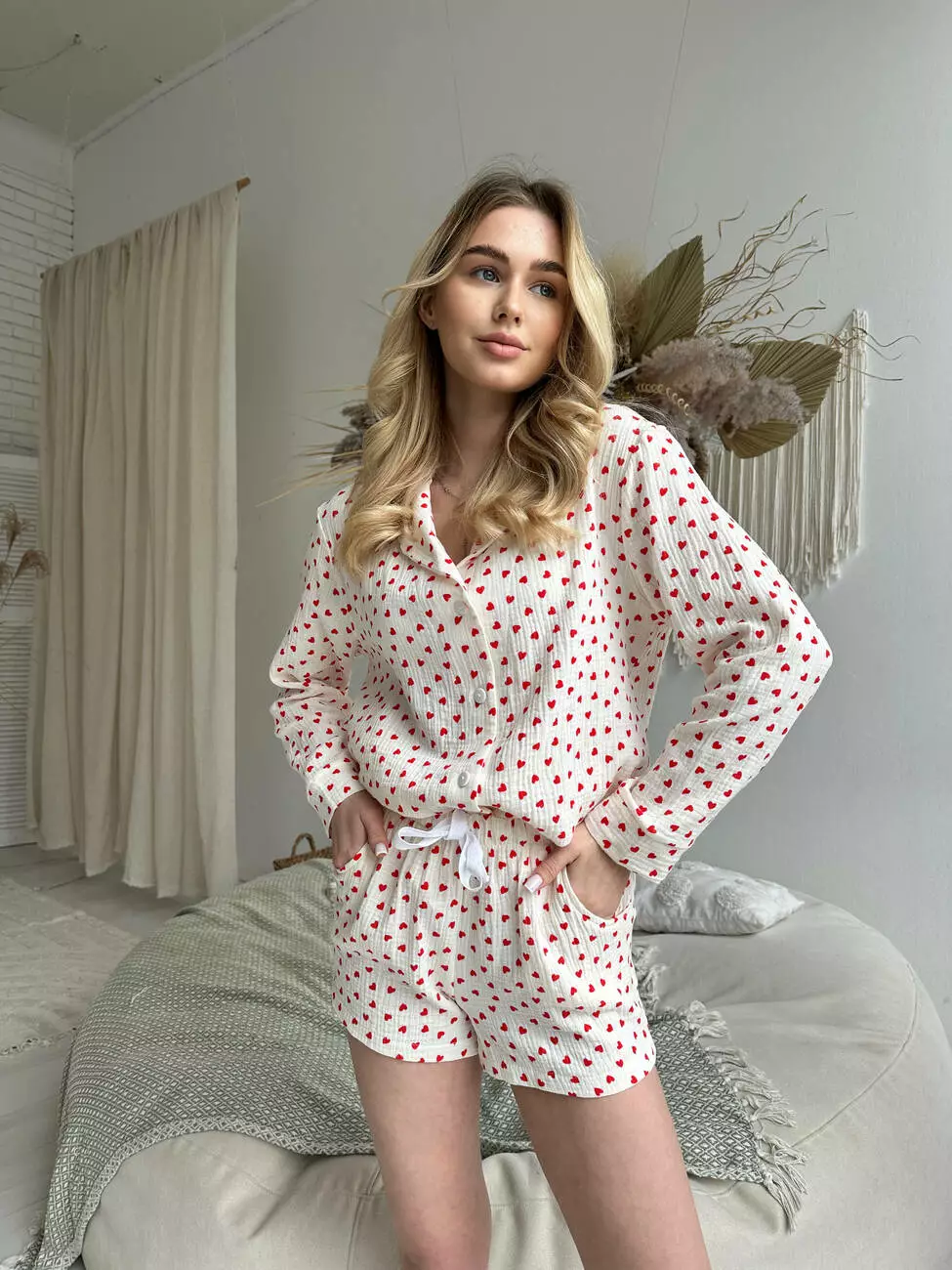 Жіноча Муслінова піжама COSY червоні серця на молочному шорти + сорочка