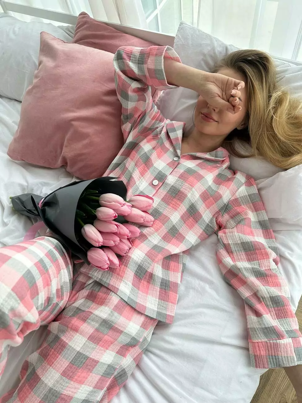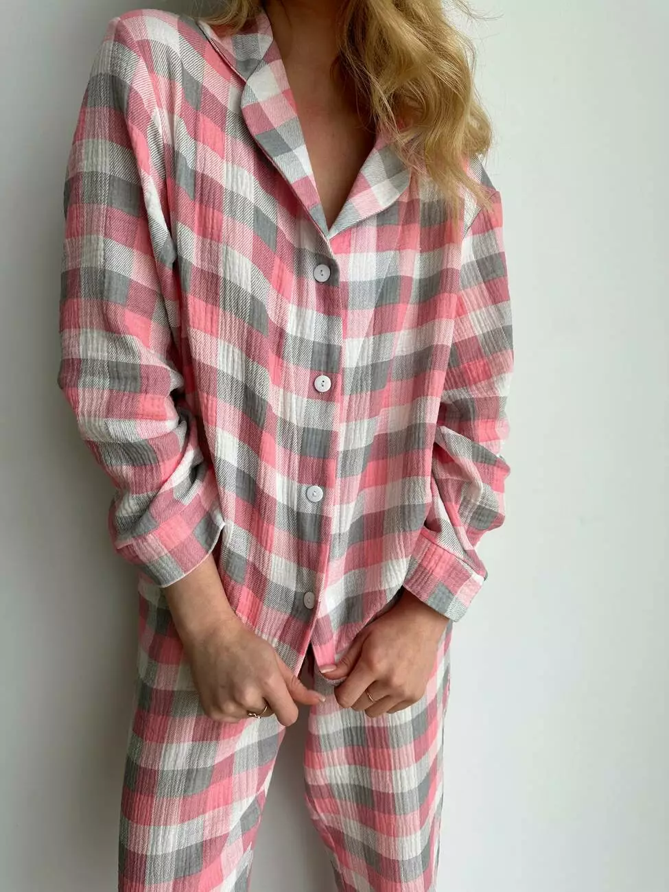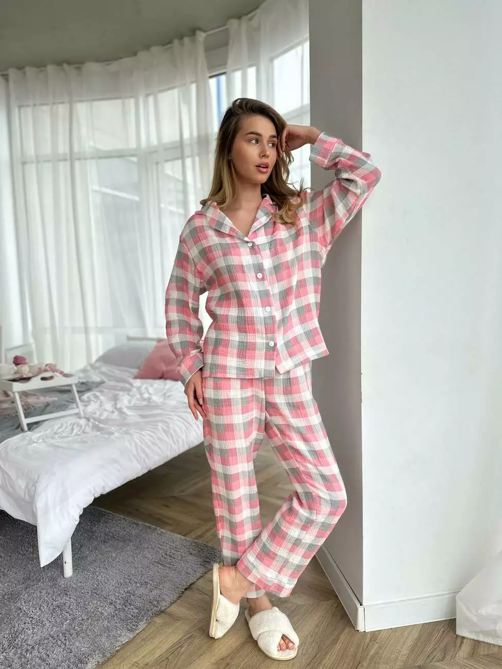 Стильна та комфортна піжамка у клітинку з мусліна. Тканина легка та комфортна.