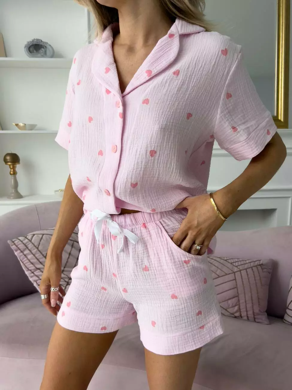 Жіноча Муслінова піжама рожеві Серця COSY шорти+сорочка