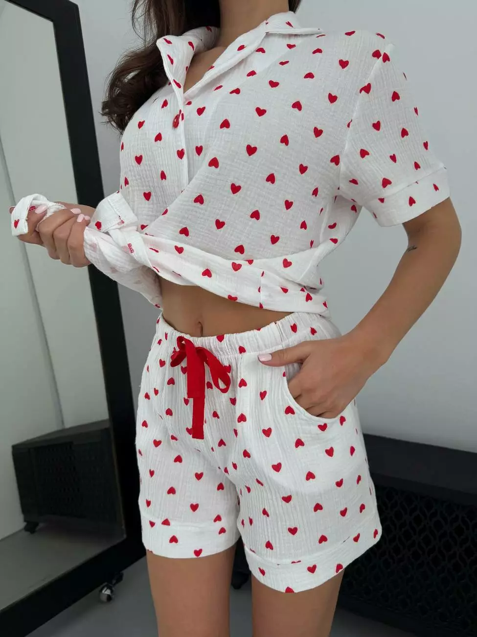 Жіноча Муслінова піжама(шорти+сорочка короткий рукав), Серця червоні на білому