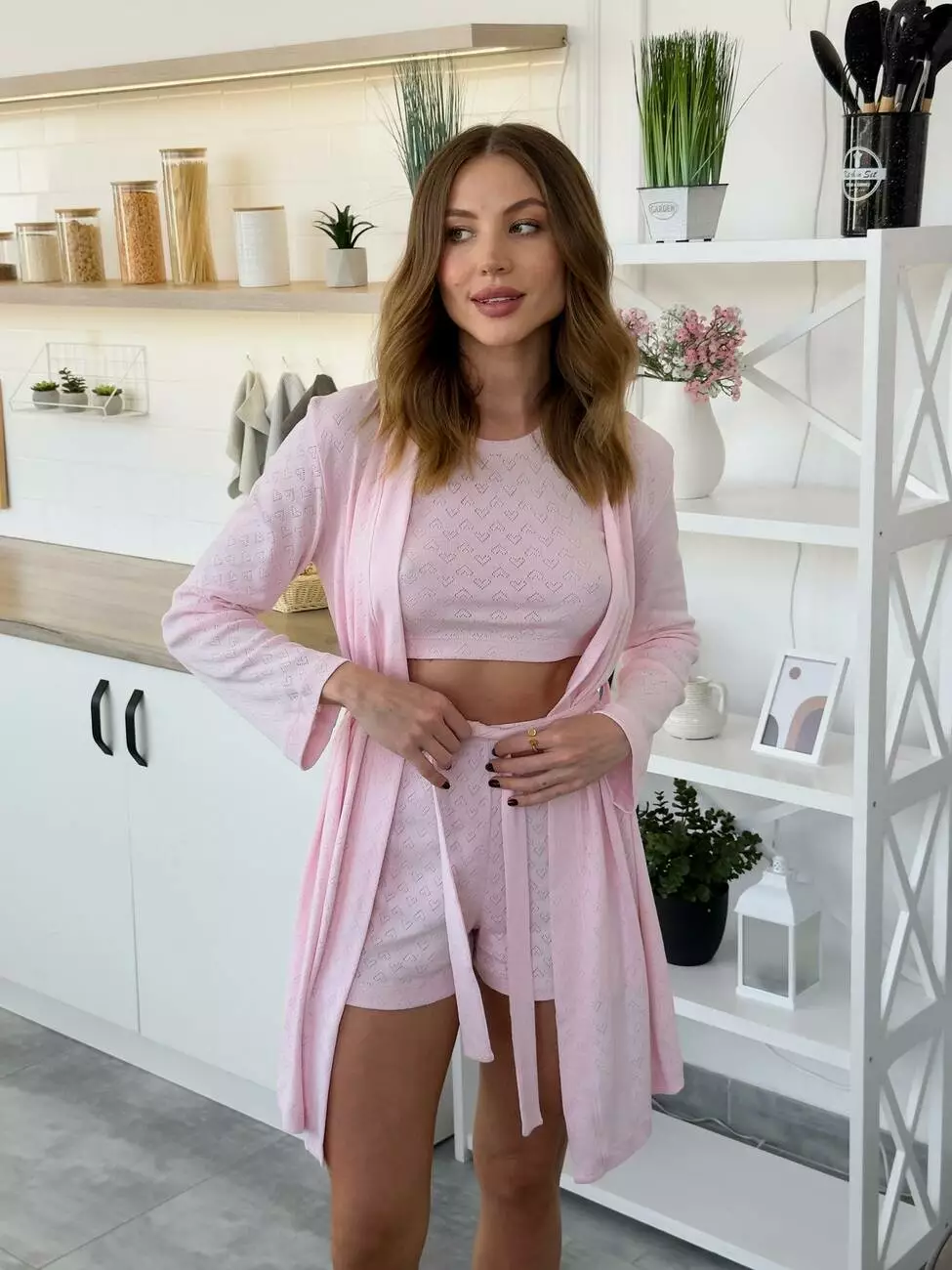 Майка кроп-топ, шорти та халатик — ідеальне поєднання для дому, відпочинку або затишного вечора для себе.