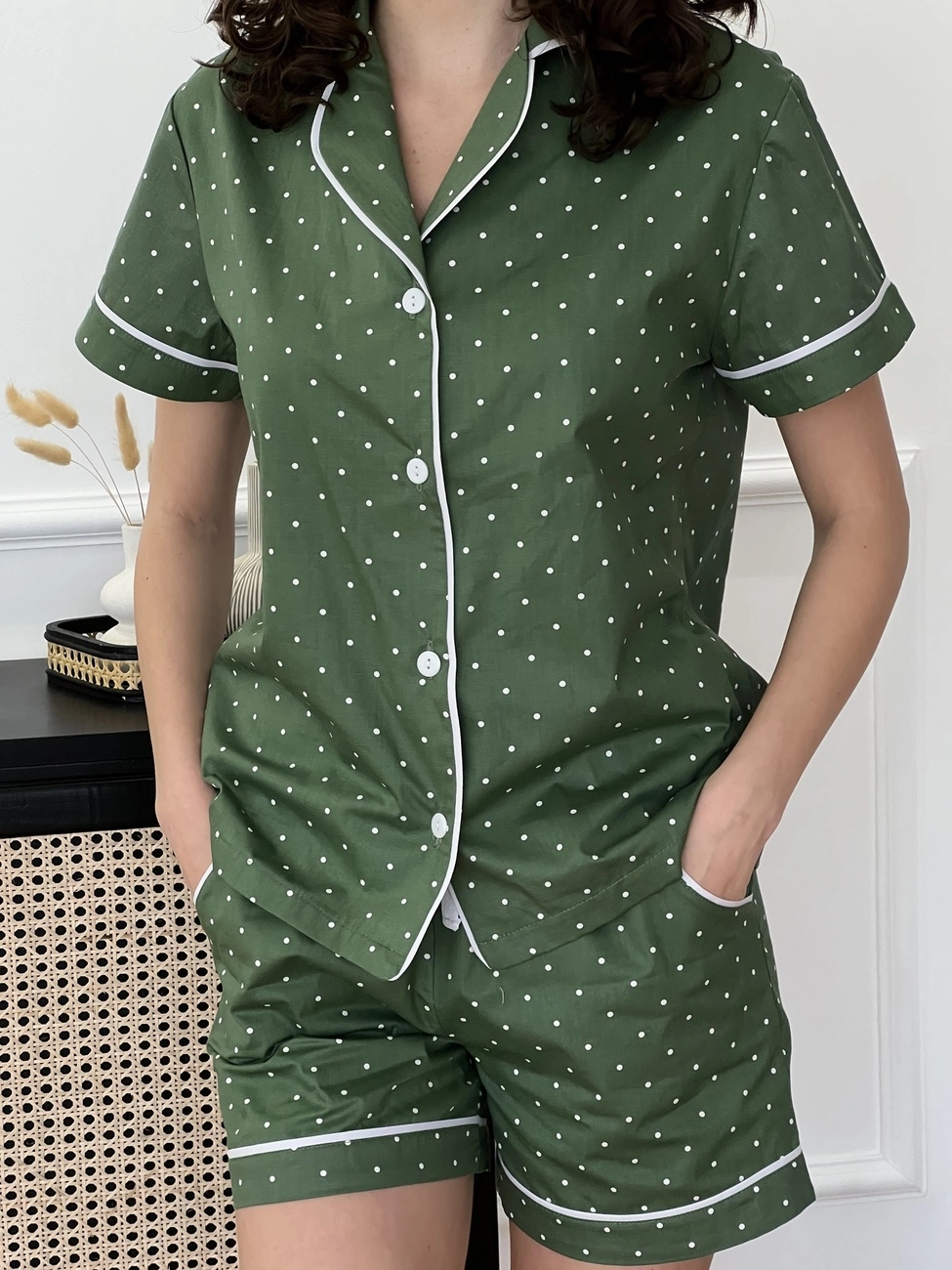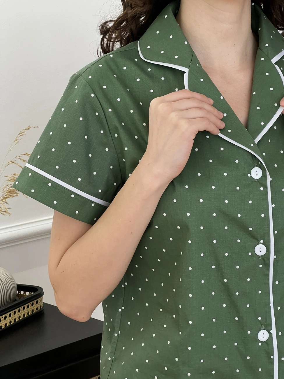 Жіночий домашній комплект з сатину COSY (шорти+сорочка) зелена в горошок