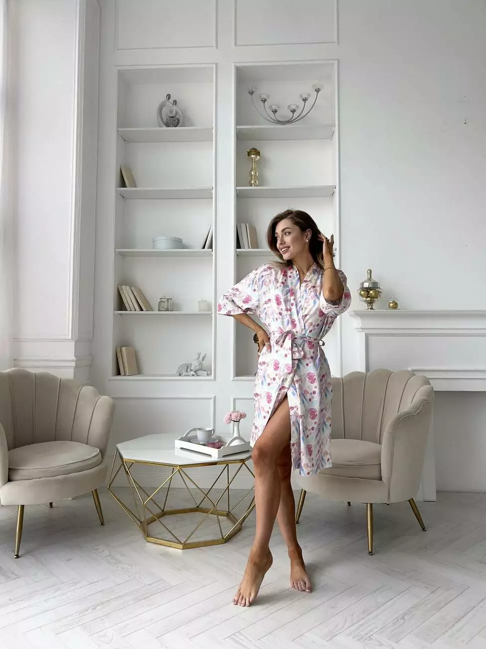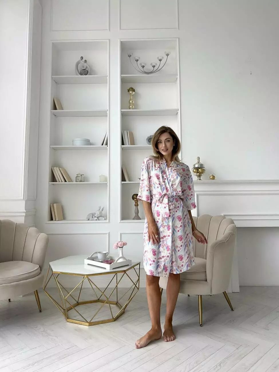 Жіночий халат "Aura" вражає своєю прекрасною та ніжною кольоровою гамою, натхненною акварельними квітами, що надають йому особливого шарму та романтичності. Тканина зовні нагадує шовк, що додає йому ще більше вишуканості та розкіші.