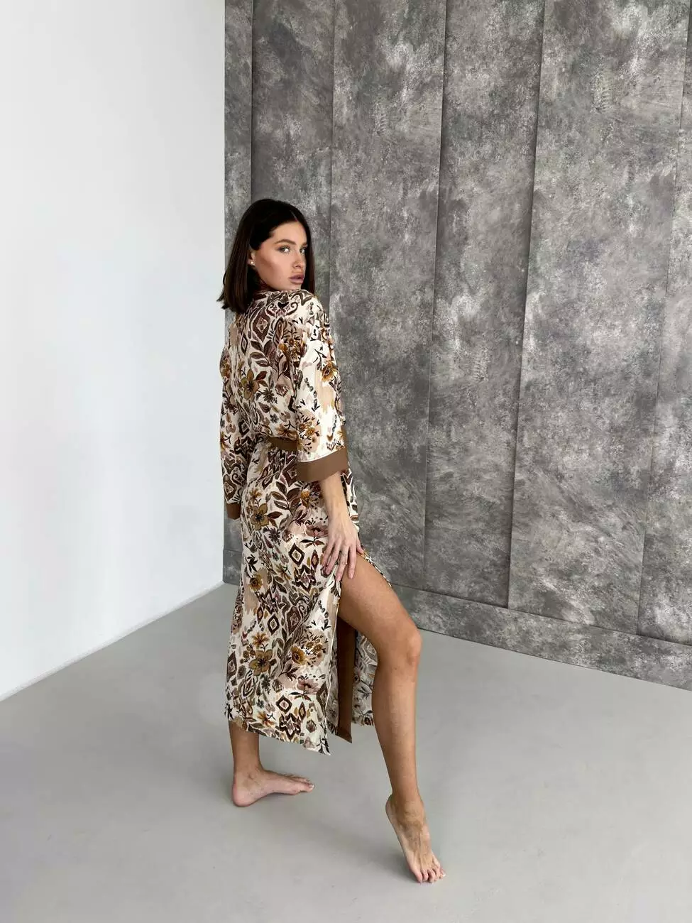 Цей халат – більше, ніж просто одяг. Це дотик ніжності, що огортає вас легким вітерцем, коли ви насолоджуєтеся ранковою кавою на терасі або мрієте під зоряним небом.