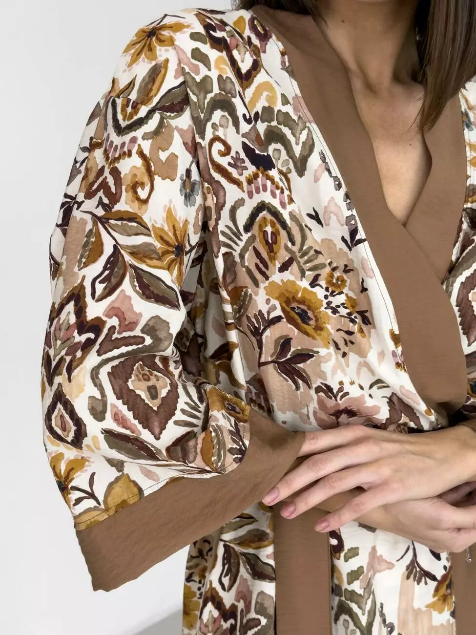 Його крій у стилі кимоно додає елегантності, а два грайливі розрізи по краях створюють легкість у русі. Тканина, ніби розписана аквареллю, немов витвір мистецтва – ніжні переходи відтінків зачаровують і притягують погляд. Однотонна окантовка підкреслює витончену красу візерунка, додаючи завершеності образу.