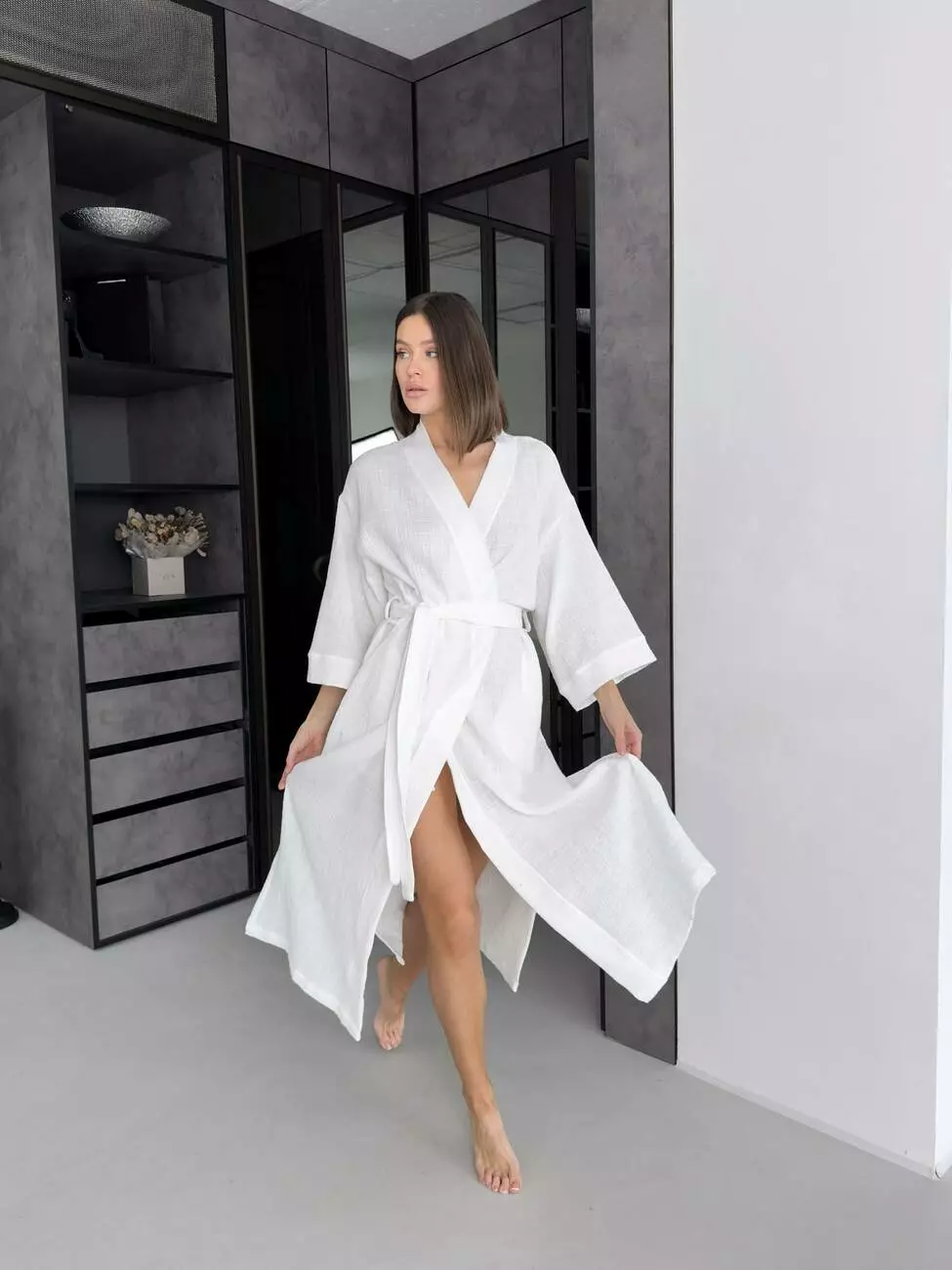 Цей халат – втілення естетики стриманої розкоші. Його білий колір символізує чистоту та легкість, а фактурний муслін із ніжною лляною ноткою додає виробу шляхетного вигляду.