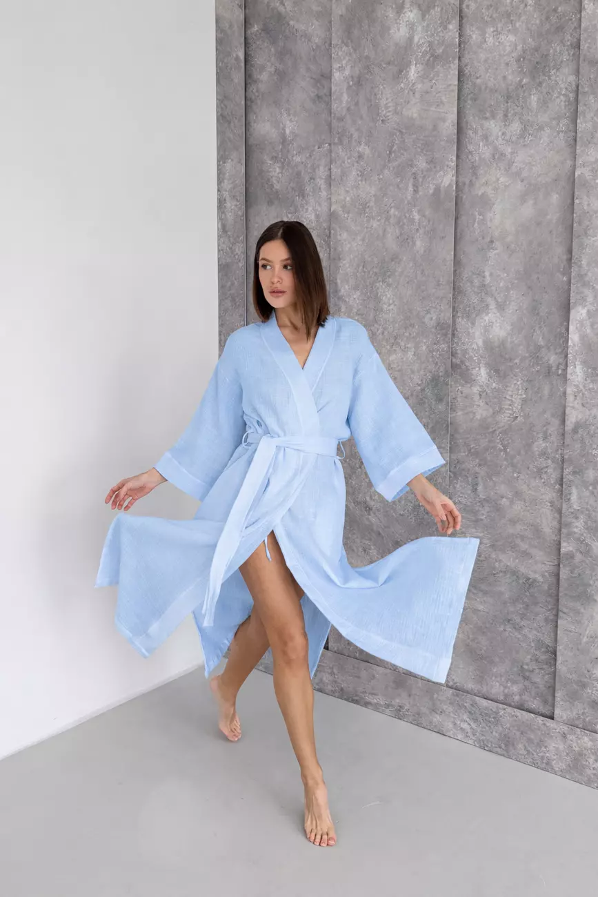 Блакитний халат-кімоно з фактурного мусліну – ніжність, що огортає з першого дотику Цей халат – як ранкове небо без хмар: легкий, спокійний і наповнений відчуттям свіжості. Його делікатний блакитний відтінок заспокоює, дарує відчуття гармонії та внутрішнього балансу, а фактурний муслін із тонкою лляною ноткою виглядає благородно й природно.