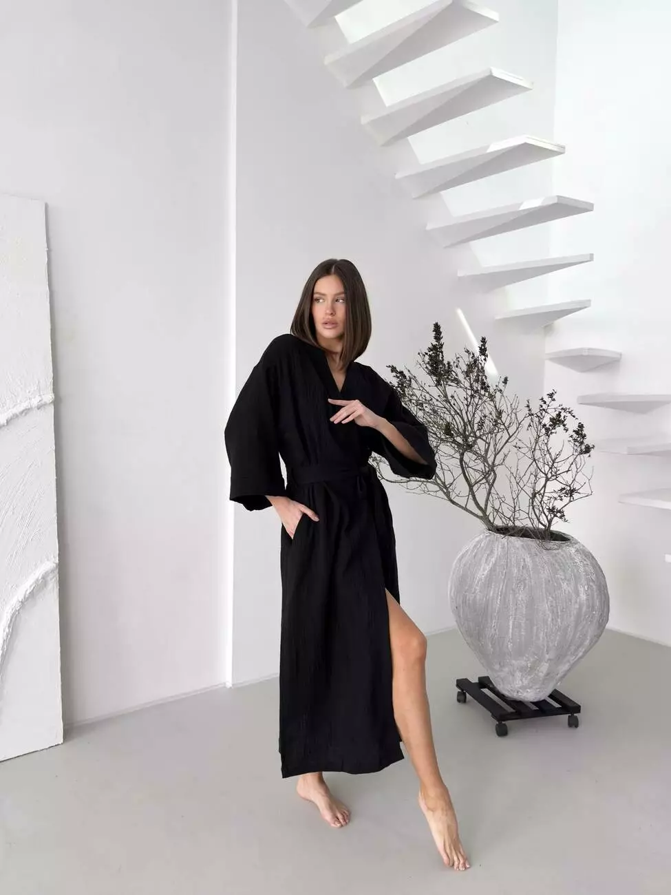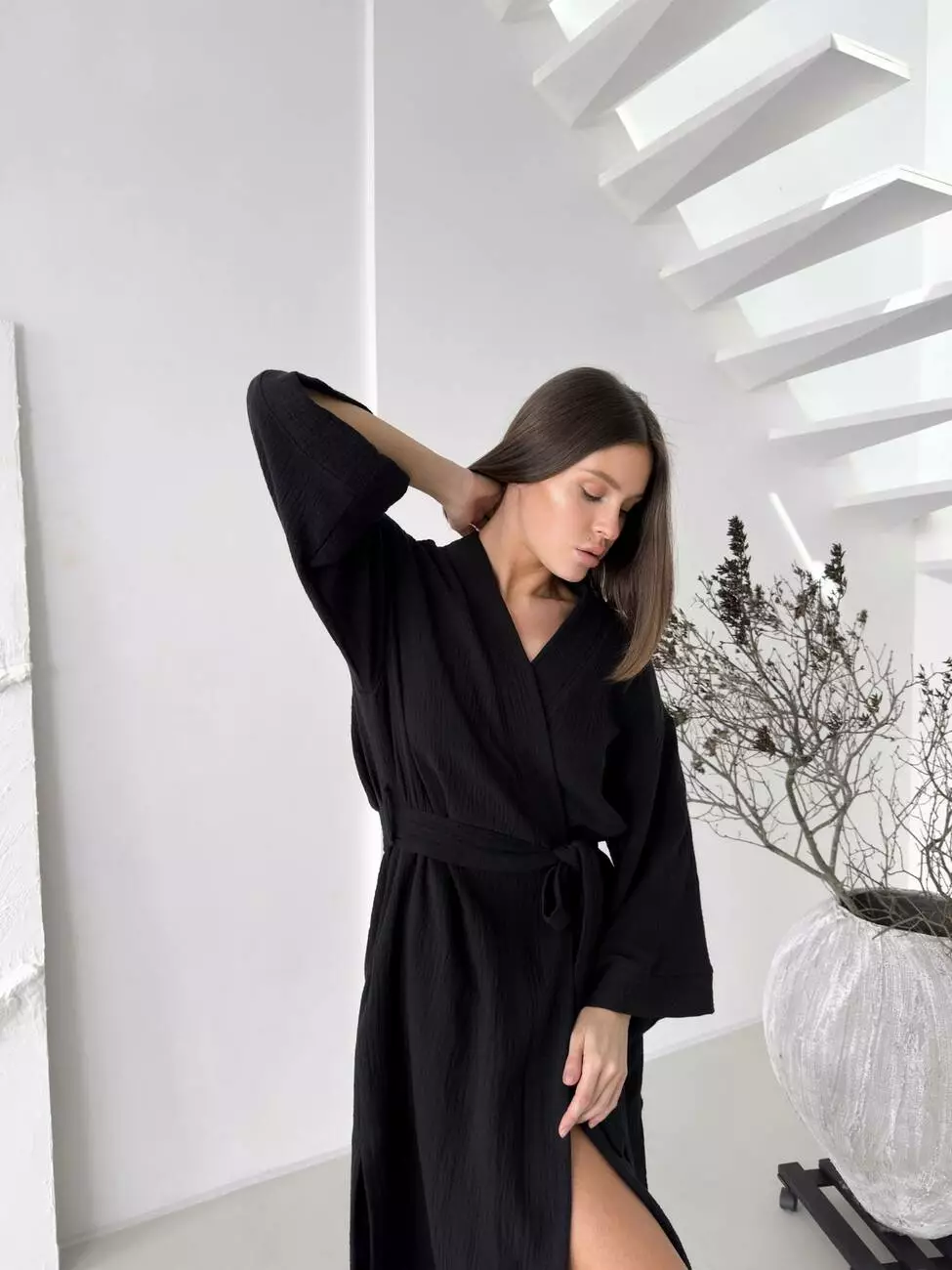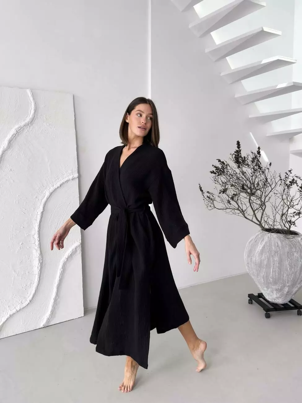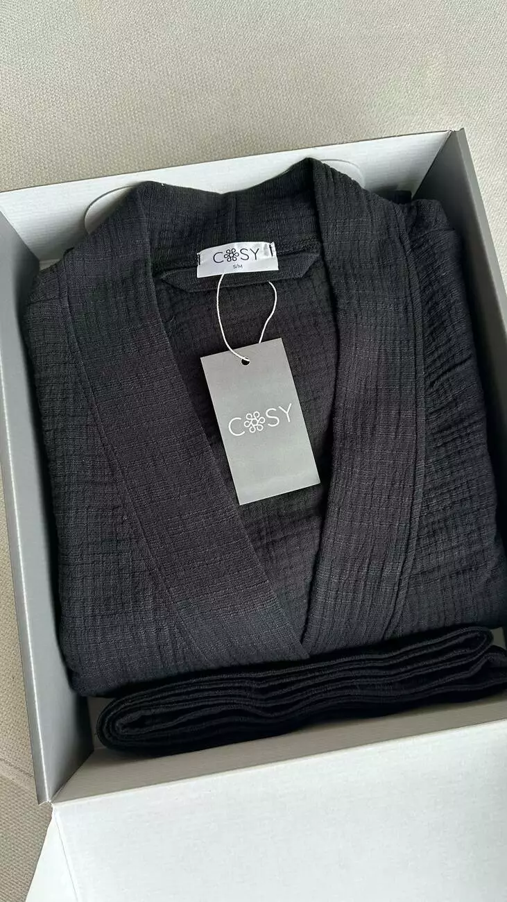 Цей халат – більше ніж просто домашній одяг. Це прояв елегантності та витонченого стилю навіть у моменти відпочинку. Глибокий чорний колір надає образу загадковості, а фактурний муслін, що нагадує благородний льон, дарує приємні тактильні відчуття та бездоганний вигляд.