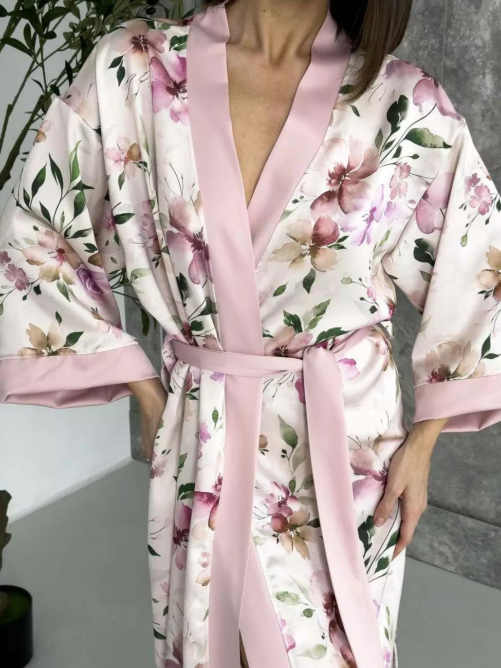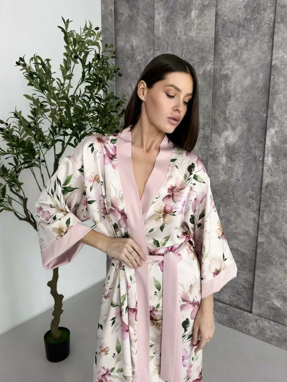 Ніжність весняного ранку: халат, що огортає розкішшю Уявіть ранок, коли перші промені сонця м’яко торкаються шкіри, а за вікном чути спів птахів. Саме таке відчуття дарує цей вишуканий халат із шовк-сатину.