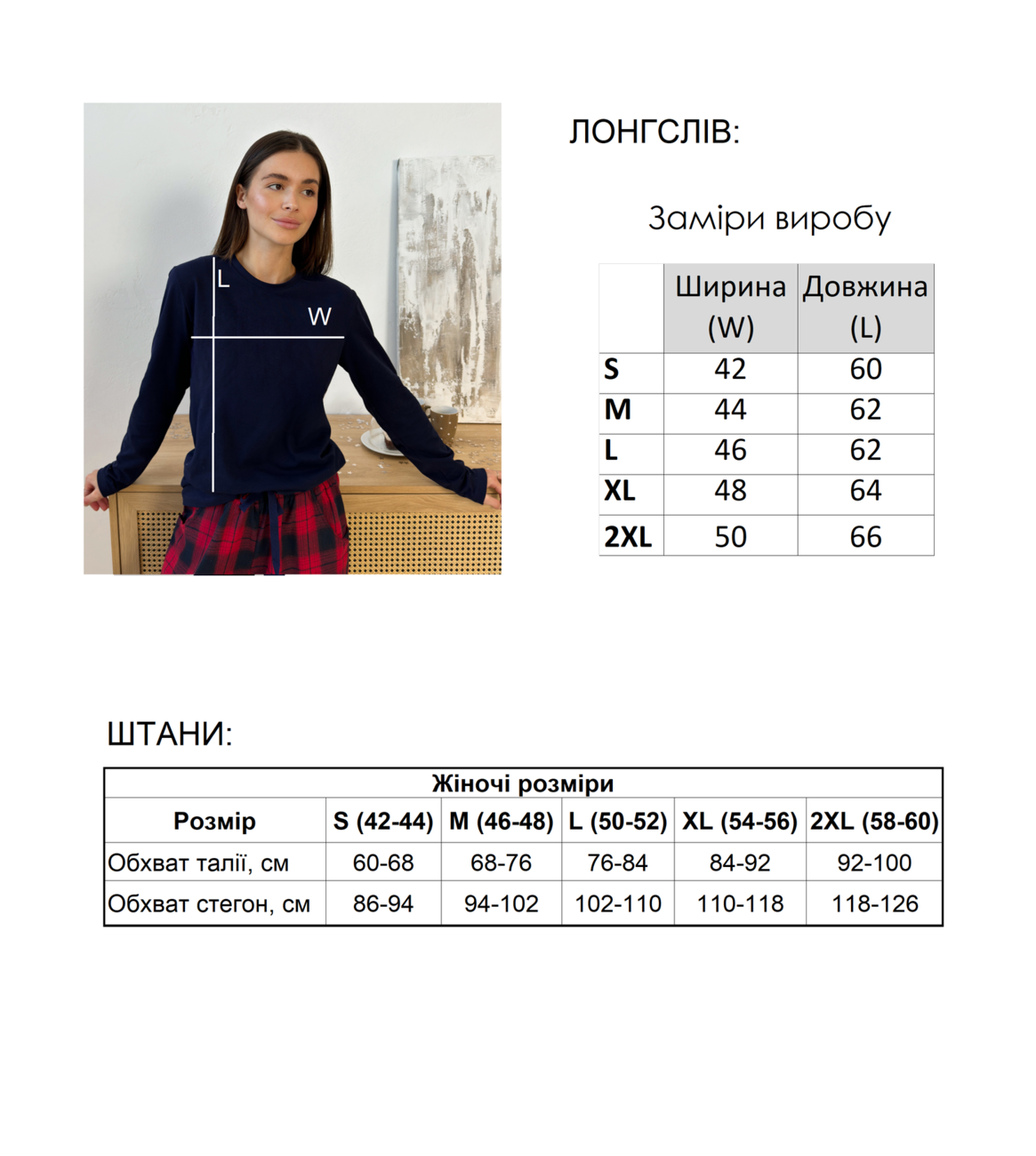 Для максимального комфорту ми пропонуємо можливість комбінувати розміри верху та низу окремо. Будь ласка, вкажіть у примітці до замовлення бажаний розмір лонгсліва. Якщо розмір не буде зазначено, ми укомплектуємо набір стандартним рекомендованим варіантом відповідно до обраного розміру штанів.