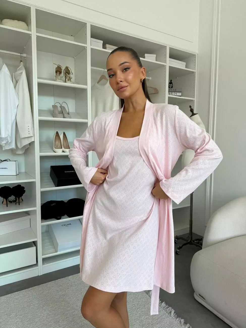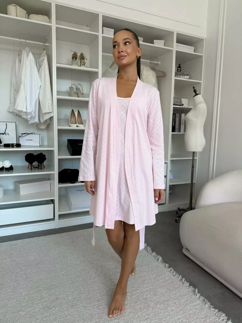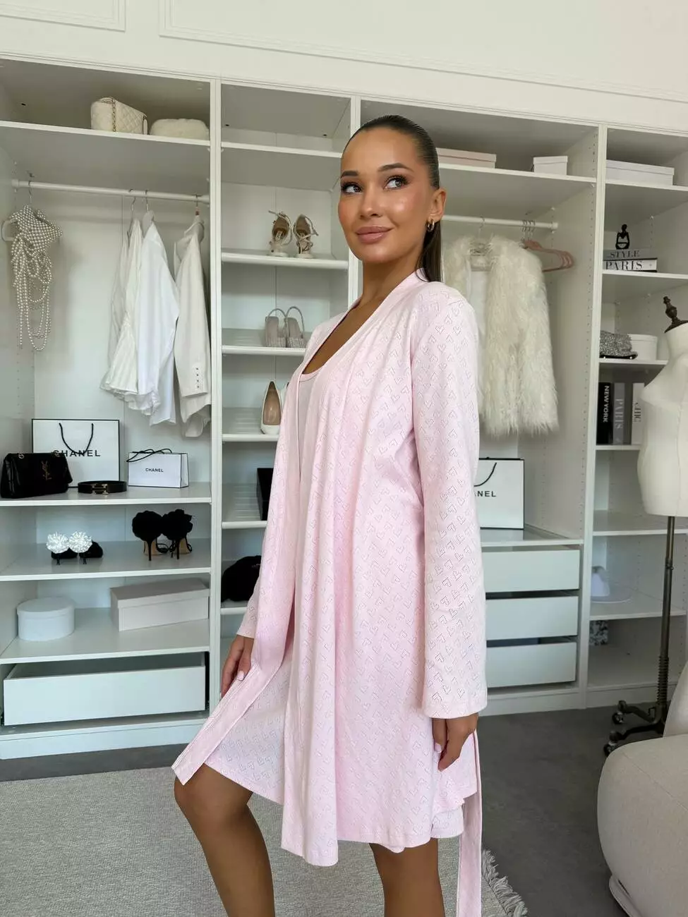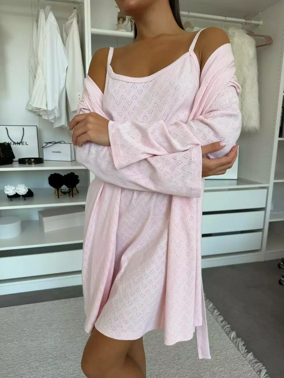 Комплект «Rose Amour» з трансферної рібани Все, що потрібно для ніжності та комфорту у щоденних ритуалах відпочинку. Ніжно-рожевий колір у поєднанні з дрібними сердечками створює романтичний настрій, а витончений пробитий візерунок на тканині додає образу особливого шарму. Сорочка на тонких бретелях та легкий халат утворюють гармонійний дует: для дому, вечірнього релаксу чи затишних моментів наодинці. Матеріал — 100% бавовна (трансферна рібана): приємна на дотик, дихає, забезпечує комфорт і м’якість протягом усього дня. Комплект «Rose Amour» — це про жіночність, легкість і турботу про себе. Сорочка: Довжина по бічному шву -66 см, разом з бретелями -83 см Довжина халата — 85 см, довжина рукава — 55 см.