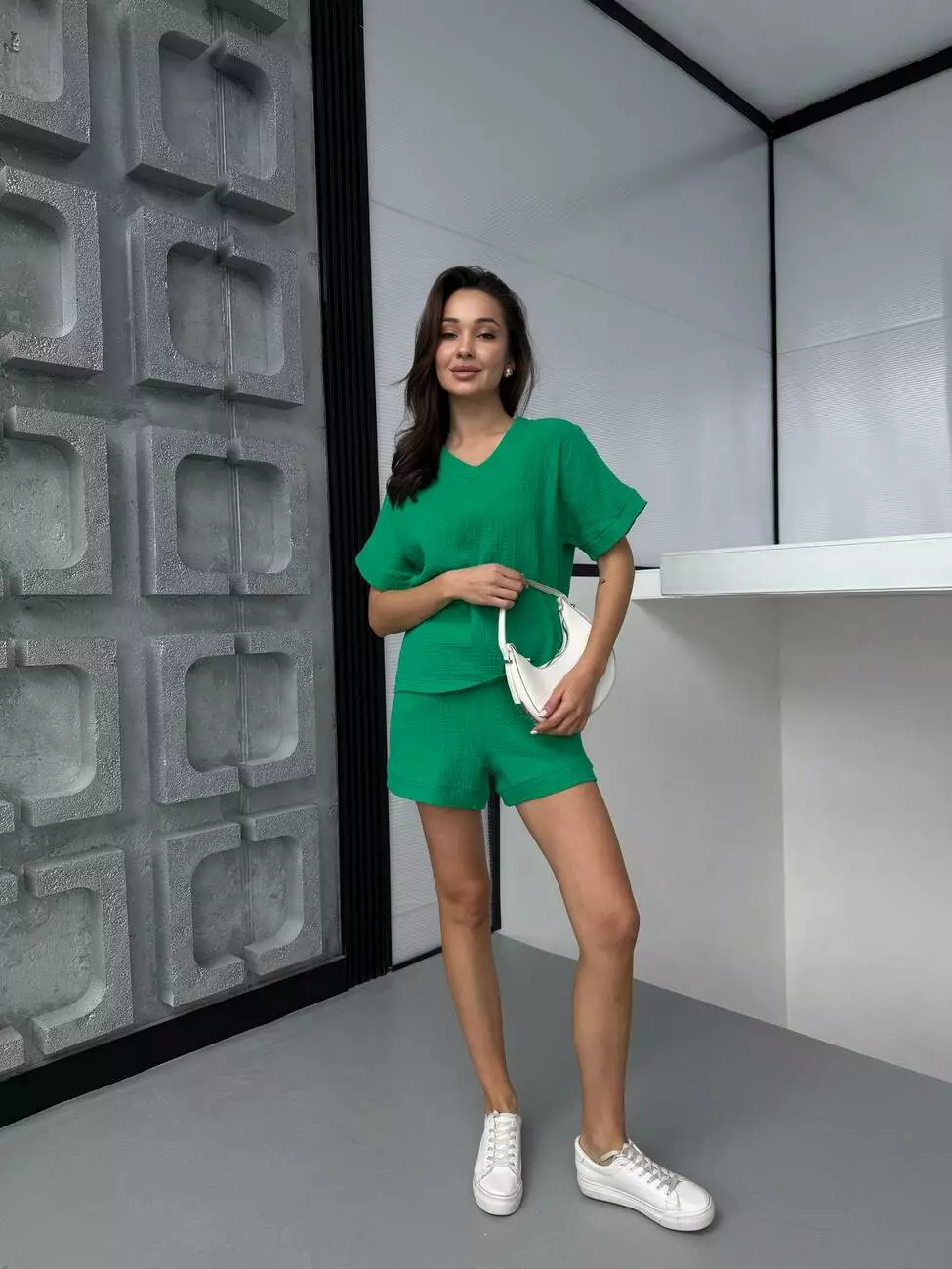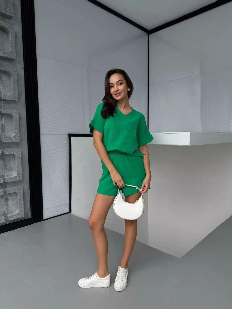 Комплект складається з футболки з елегантним V-подібним вирізом і зручних шортів із кишенями.